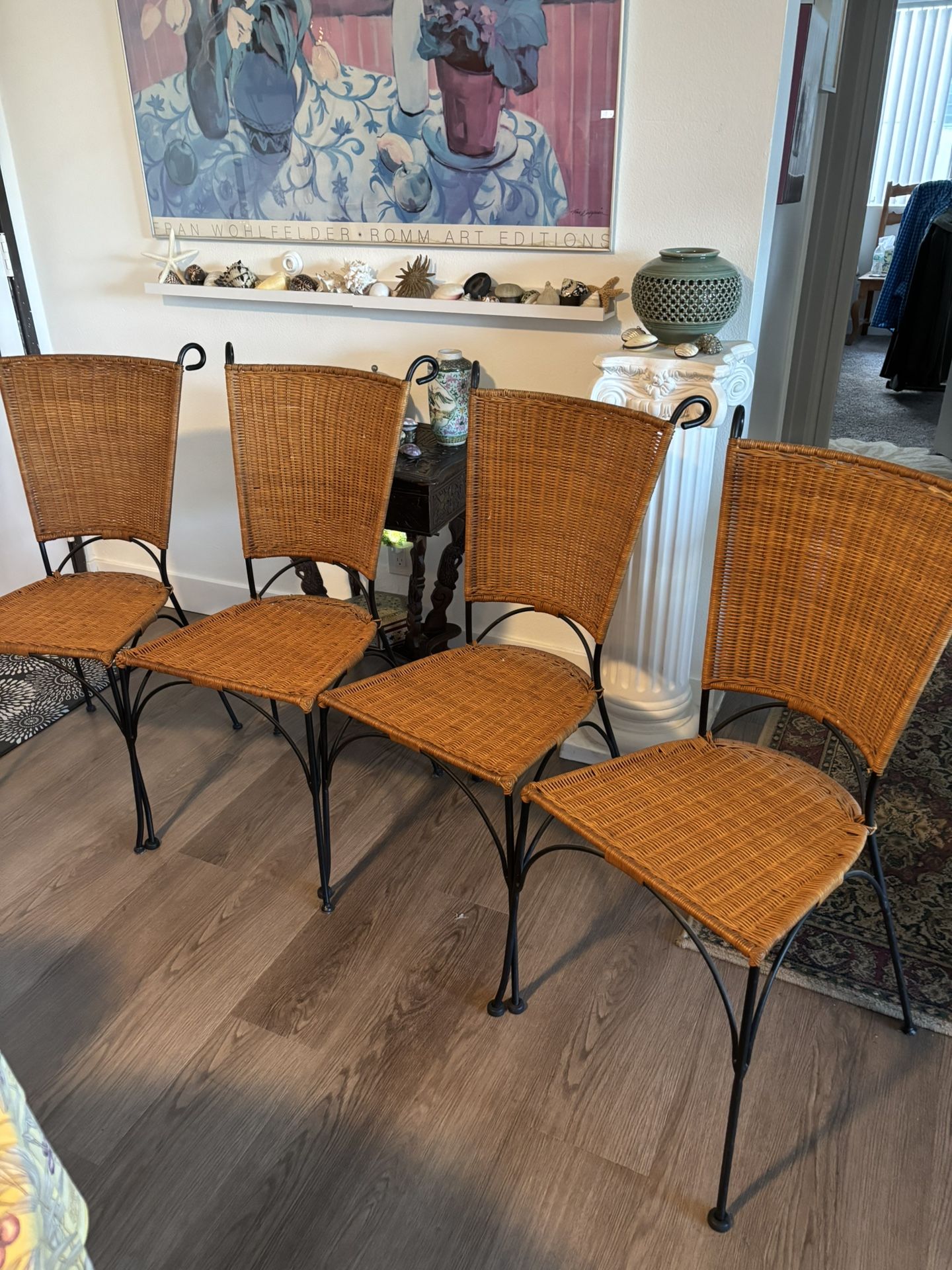 Black wrought iron frame and wicker seat and back. Very sturdy and in perfect condition.