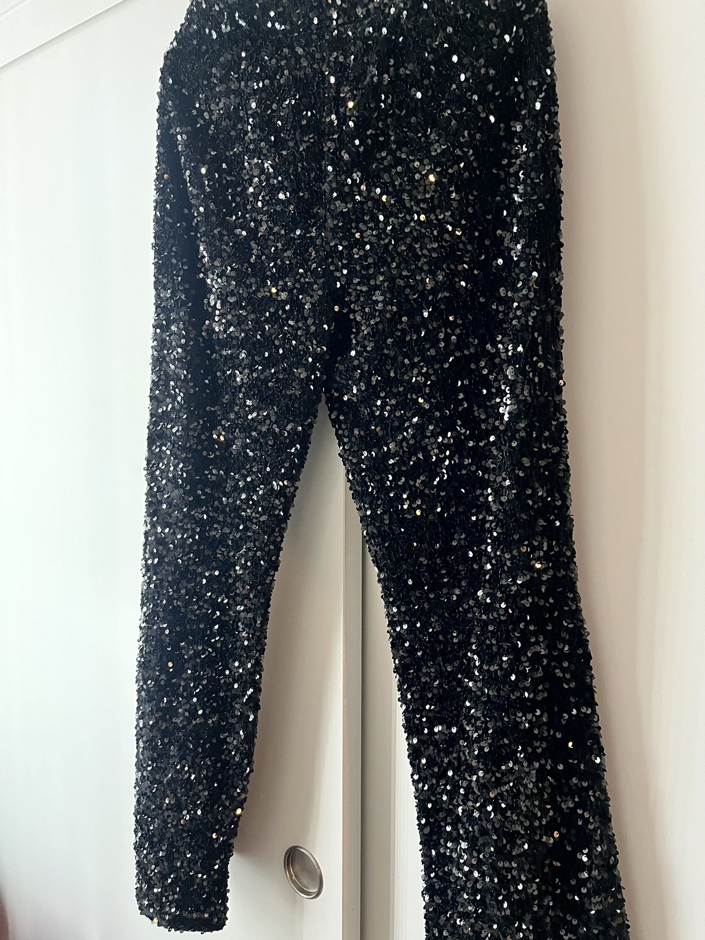 De lentejuelas todo negro, brillante elegante, no se caen las lentejuelas, elástico talle alto , muy bien diseñado y de buena calidad .