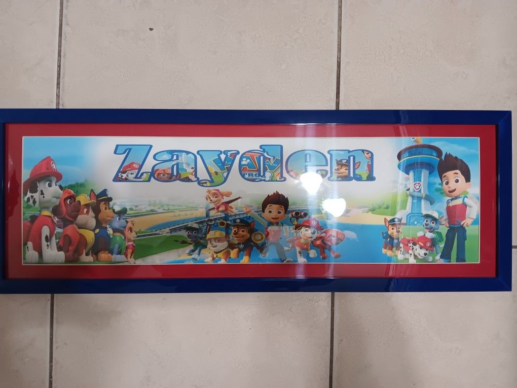 Brand New Paw Patrol Name picture ... Blue frame with "Zayden'" printed inside. There are 2 points to hang from the back and Measures approximately 29" x 10"