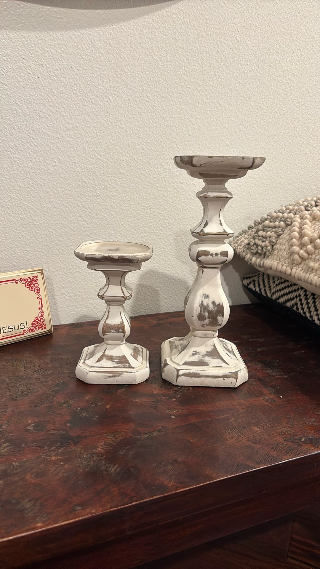 Two beautiful wood candlesticks in great condition, French country/cottage/distressed style off white, smaller is a little over 6 inches tall and the other is 10.5 inches tall, take both In the Orangecrest area of riverside