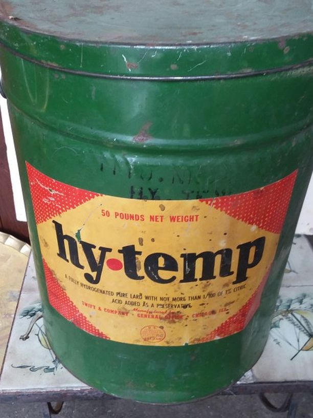 Neat old tin large 50 pounds About 12 1/4" diameter About 16 " tall Dented rusted but still very presentable.