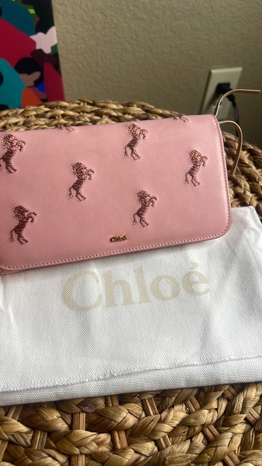 Color is the baby pink, lighting makes it look purple with the flash on. Great condition Full leather Comes with dust bag Unique piece!