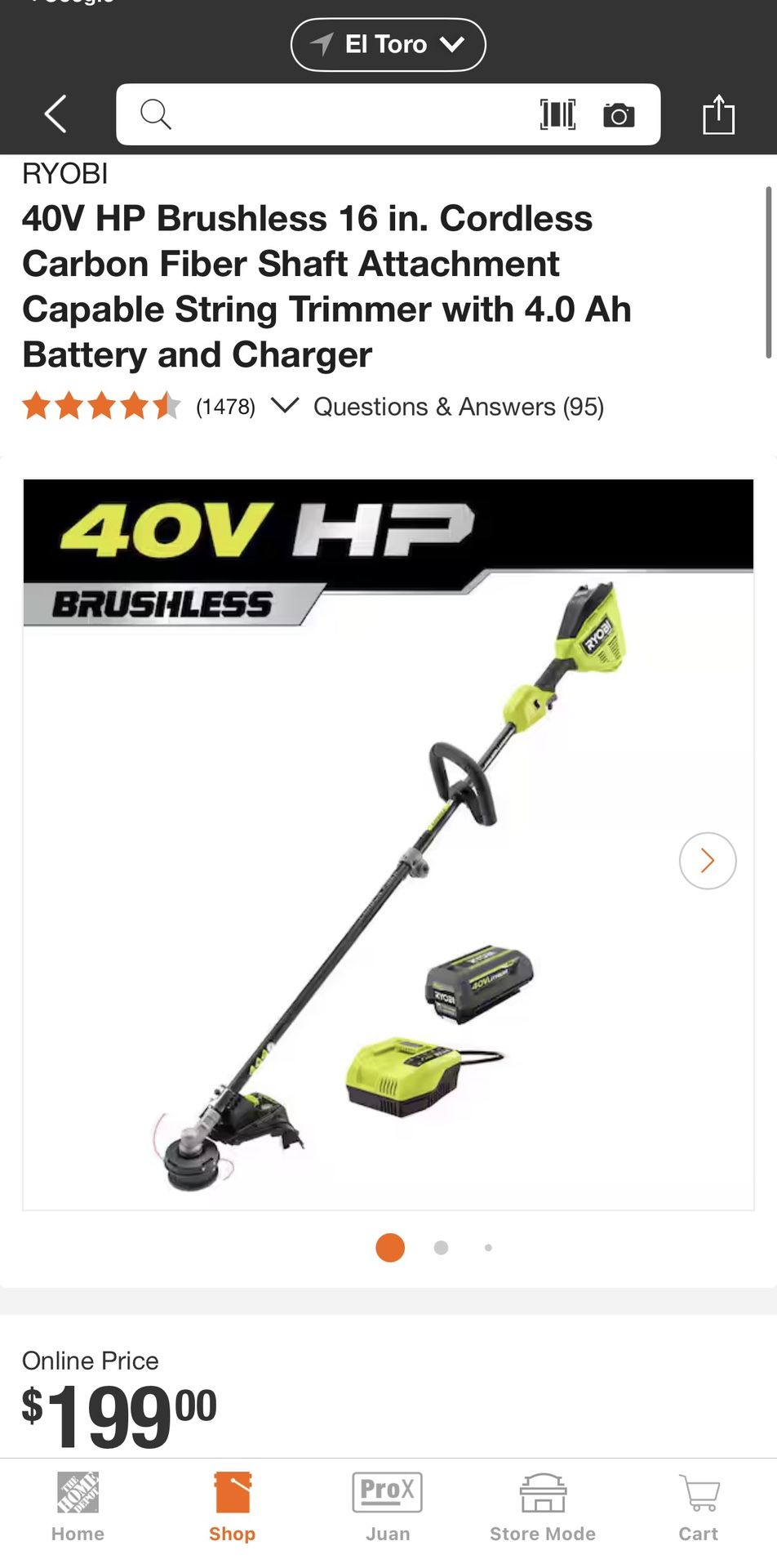 RYOBI 40V HP Brushless 16 in. Cordless Carbon Fiber Shaft Attachment Capable String Trimmer with 4.0 Ah Battery and Charger ($120)