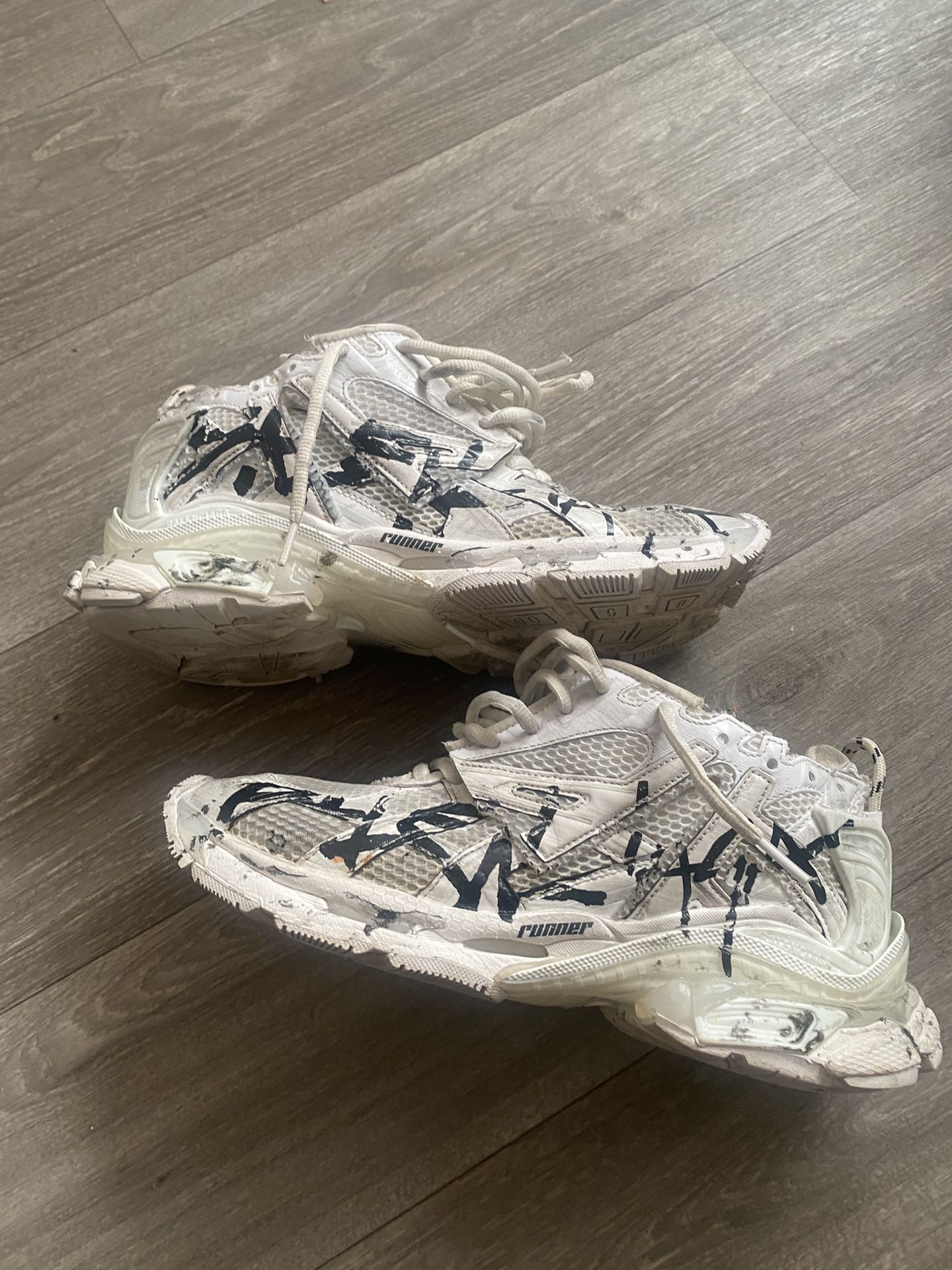 White balenciaga graffiti runners decent condition, graffiti is peeling so that’s why i’m selling throw any offers or trades must COME PICK UP OR MEET UP