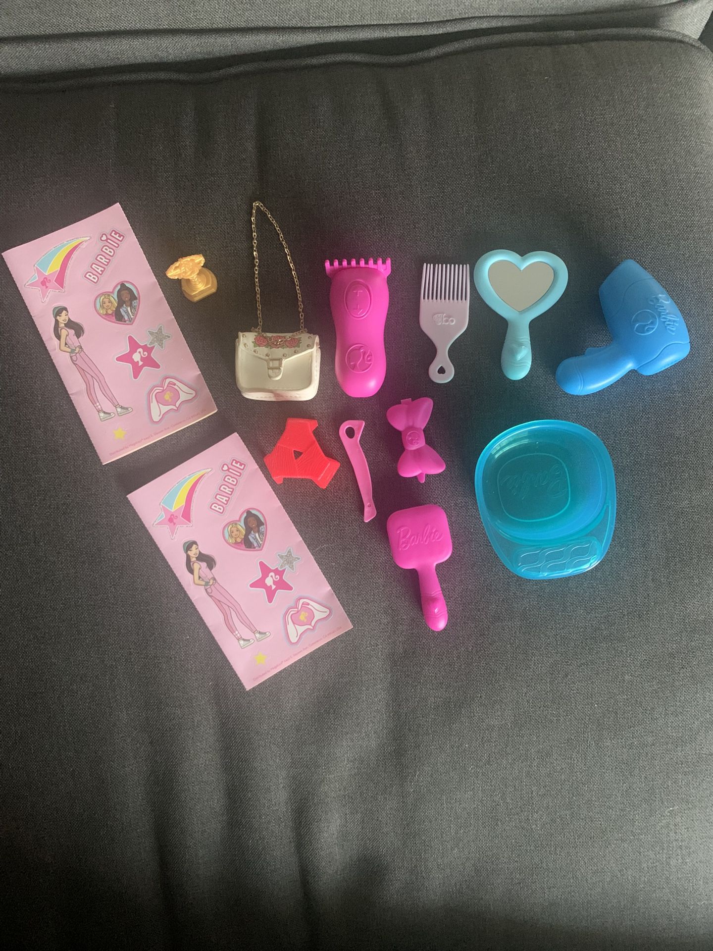 Fun Barbie accessory set with vibrant pink and blue items. Includes comb, hairdryer, and more. Perfect for creative play.