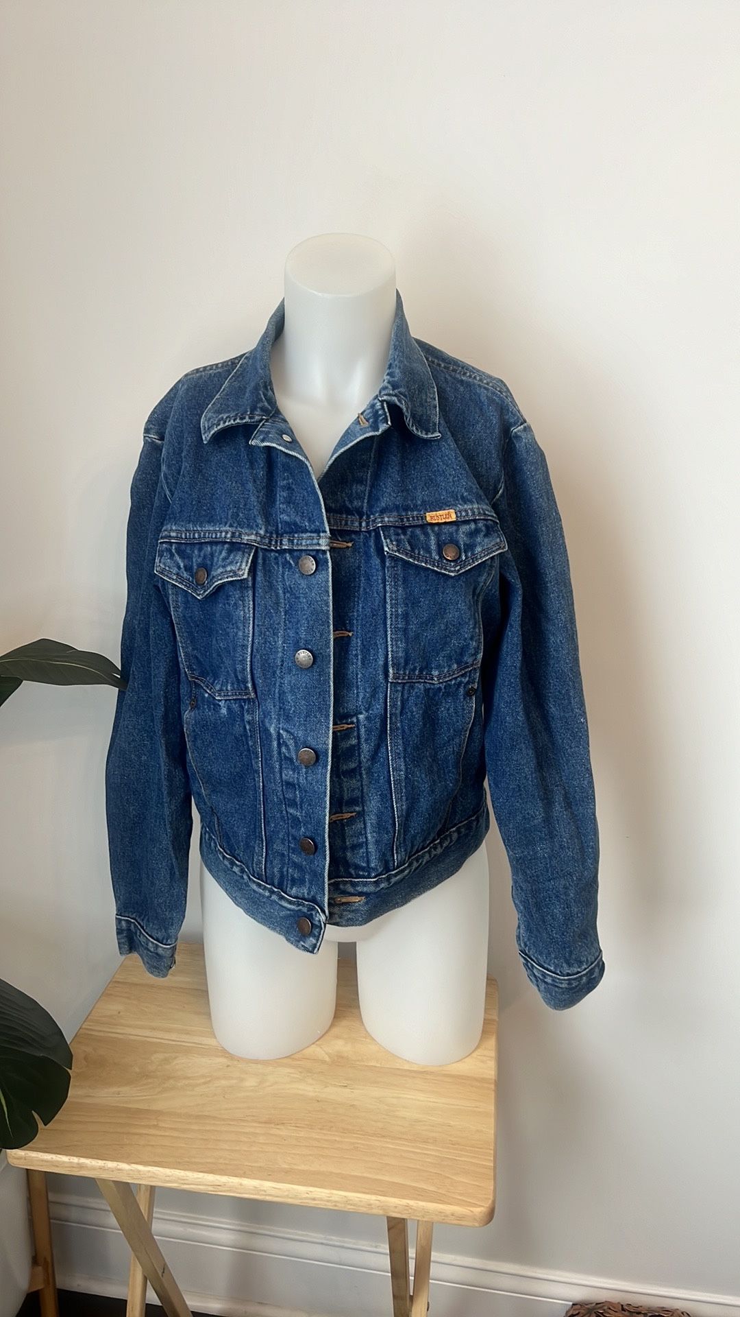 Rustler vintage Jean jacket Approximately 23" inches long and 20 inches under armed under arm * gently used vintage lock few light spots on the front and wear on the back of the neck. Please see photos 1980 PERFECTLY WORN RUSTLER DENIM JEAN JACKET for pockets on the front two pockets on the inside Vintage store selling for $118 100% cotton * cool vintage rockabilly CATEGORY $50 $85 Offer /