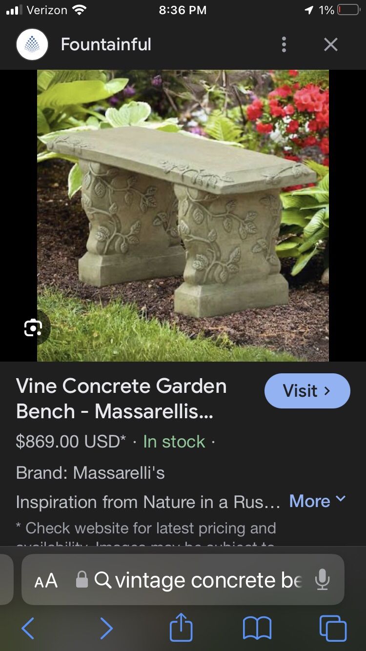 Vintage 3 piece stone garden bench with grape leaf motif throughout. This bench measures 38’ wide 16’high 13’ depth of seat This item is available for pick up in NE Tacoma We have several stone pieces including vintage large pots