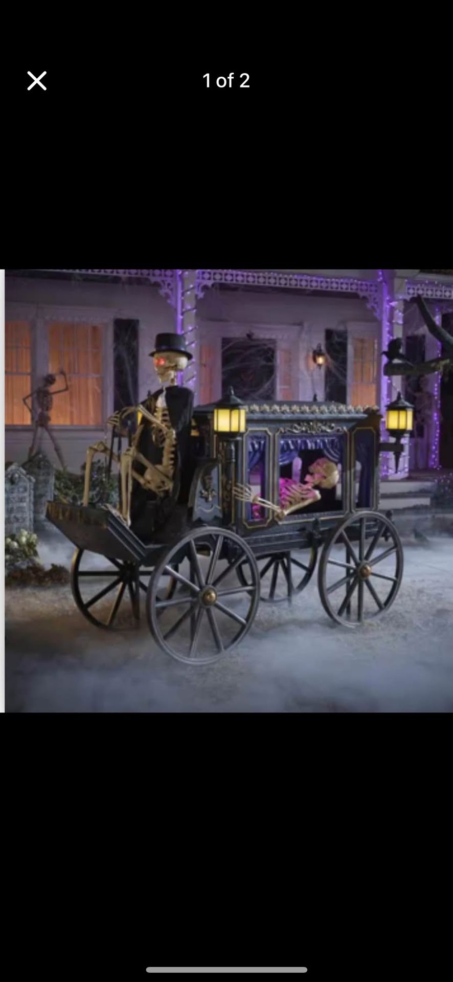 New in box Heavy. Must pick up in Wayne Wv The Home Accents Holiday 5ft. Grave & Bones Animated LED Hearse is back with a new design this year. The hearse includes (2) 5 ft. tall skeletons, one that is driving the hearse and one that is riding in the hearse. An eerie purple glowing light illuminates the unlucky skeleton passenger within, while (4) flickering flame lanterns light the path to creepy destinations. The driver is sound sensor activated, has an animated jaw and speaks 1 phrase with spooky sound effects. This item is suitable for indoor or outdoor use. Pairs great with the 5.5 ft. Grave & Bones LED Skeleton Pony. Package Dimensions 28.74"D x 40.55"W x 40.55"H Indoor/Outdoor Sound sensor activated Skeleton driver has red LED illuminated eyes and an animated moving jaw Skeleton driver speaks 1 phrase and includes spooky sound effects Hearse has 4 flickering LED lanterns on the outside and 1 steady glowing LED light on the inside 3-pieces included: 1 hearse, 1 poseable animated LED skeleton driver and 1 non-electronic poseable skeleton 1-person assembly in 30 minutes Battery operated; Requires (6) AA Batteries, Included Timer: 6 hours ON / 18 hours OFF