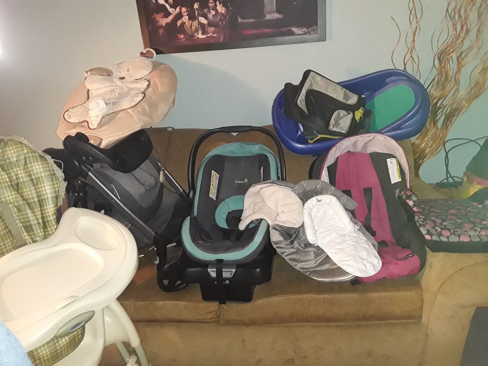 High chair $15 Diaper bag $15 Bathtub $5 Bouncy chair $10 Car seat $20 each Booster car seat $10 Stroller with matching carseat and base $70 Changing table $10 All $120 Or Sell separately OBO