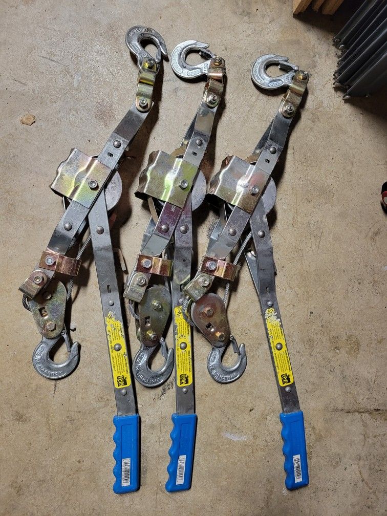 3 Maasdam industrial 2 ton come-a-long pullers w/ 12 foot cable. These pullers are basically new. They have been hanging in my garage for 4 years and had no use. They saw very little use for about 6 months before they went in the garage. They retail for $80.00 each.