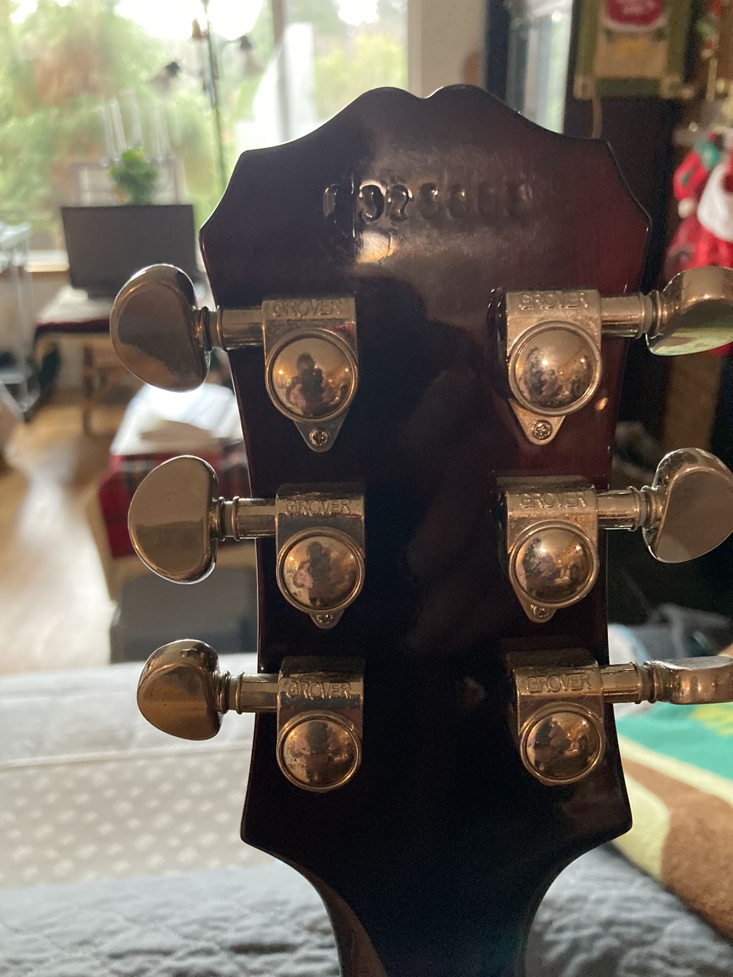 Item has been cleaned and polished frets have been polished neck has been oiled with lemon oil and new strings have been applied. Item has also been set up. This is similar to the one that George Harrison plays on the video revolution burgundy Les Paul.