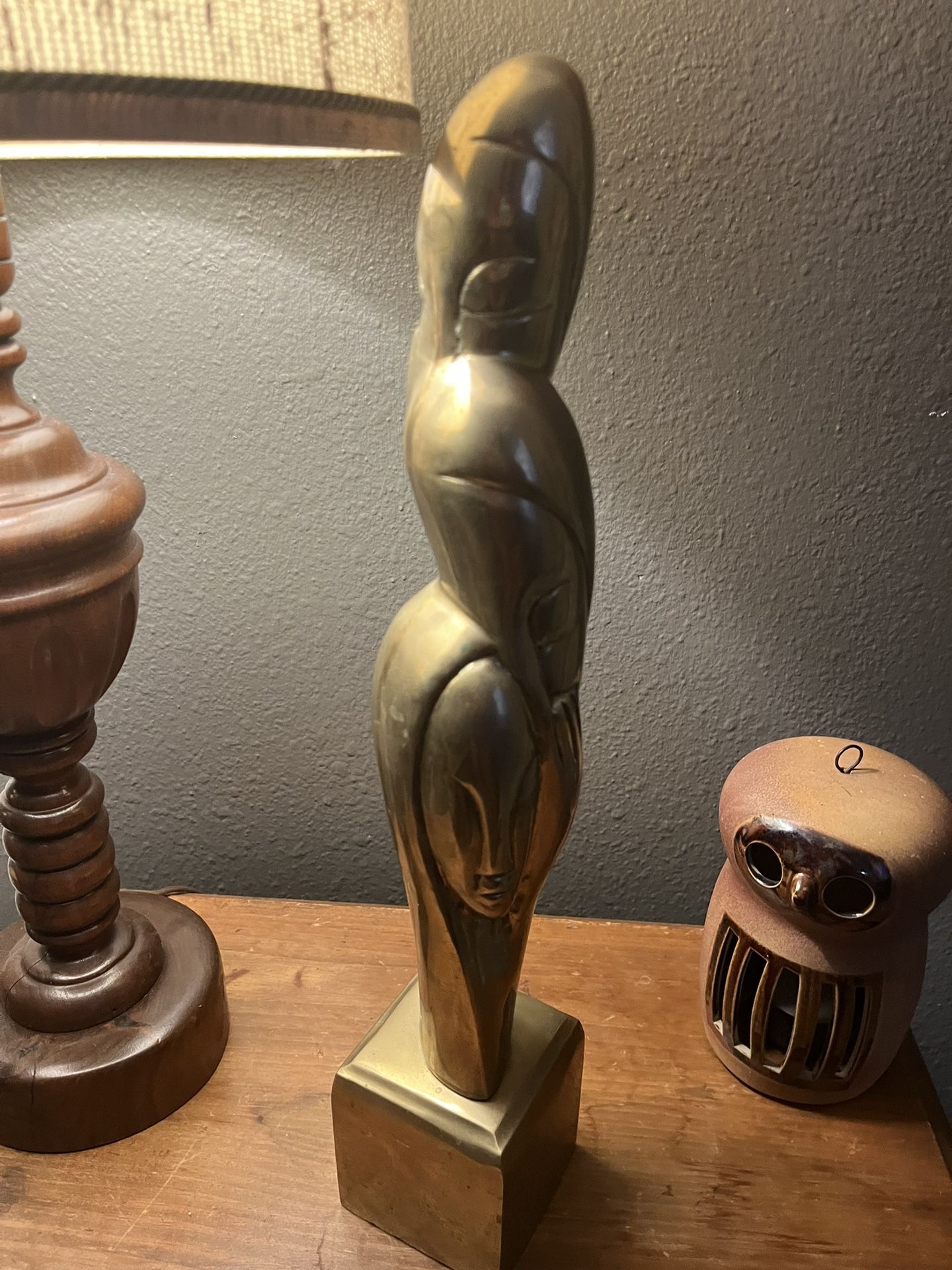 Heavy. 17.5” tall. 3”wide Unique brass sculpture.