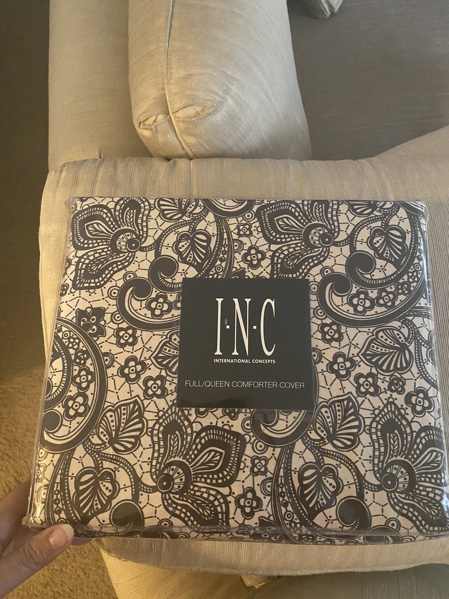 Never opened, Duvet cover set. Cream with a Black Lace print over the cream color. Originally $145.00 plus tax. I saved it for a later time and never ended up decorating with those colors.