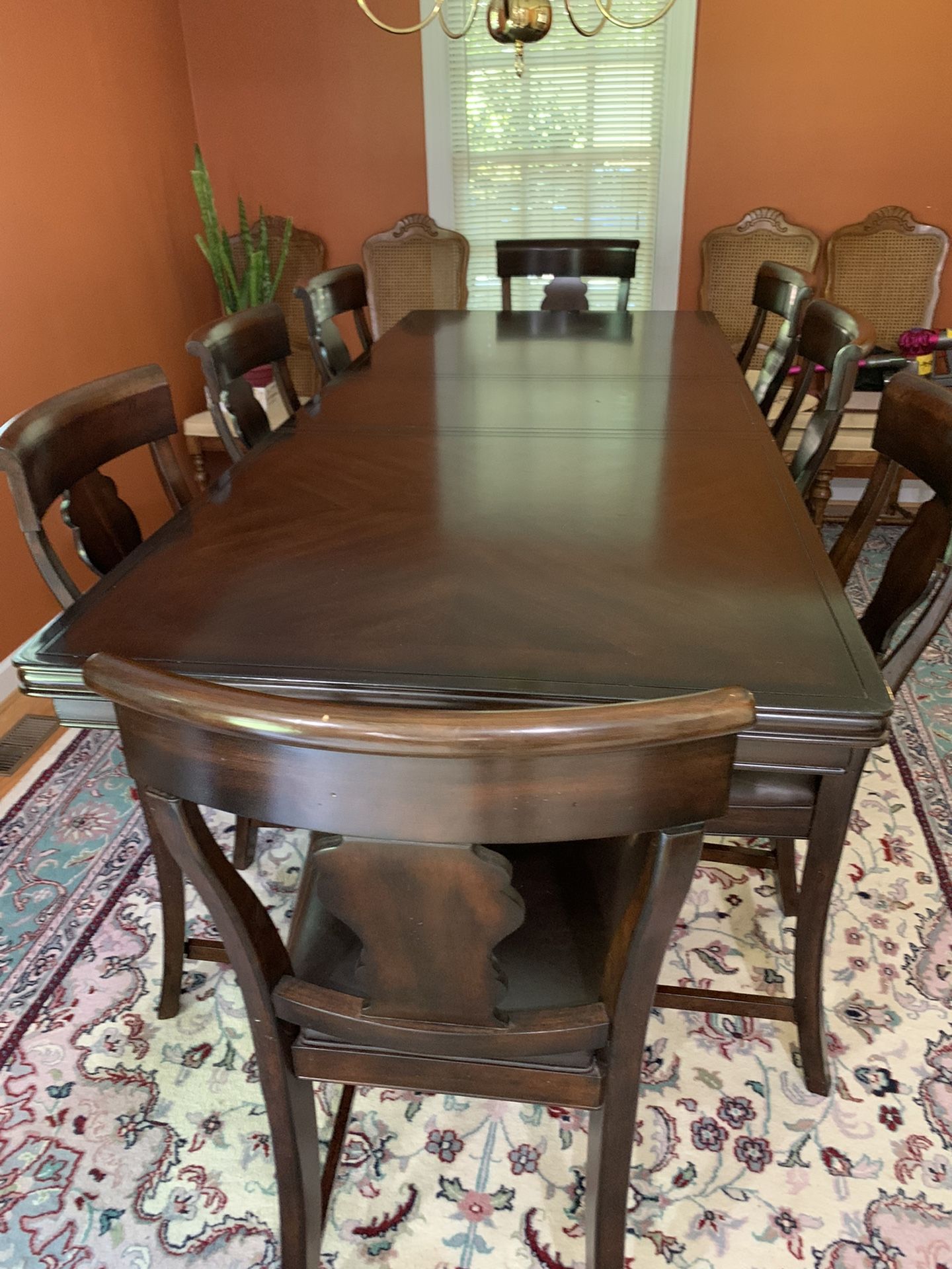 Dining table with (1) leaf and 8 chairs. Counter height. Excellent condition. Located in Williamsburg, VA.