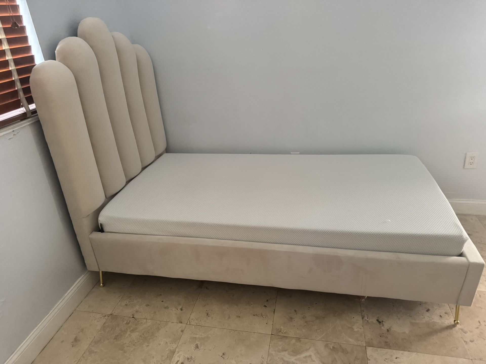 Stylish upholstered twin bed frame with tall channel-tufted headboard. Comes with a comfortable twin mattress in great condition. Neutral beige/cream fabric works well with any décor. Bed is sturdy, modern, and ready to use — no need to buy separately. Pickup only