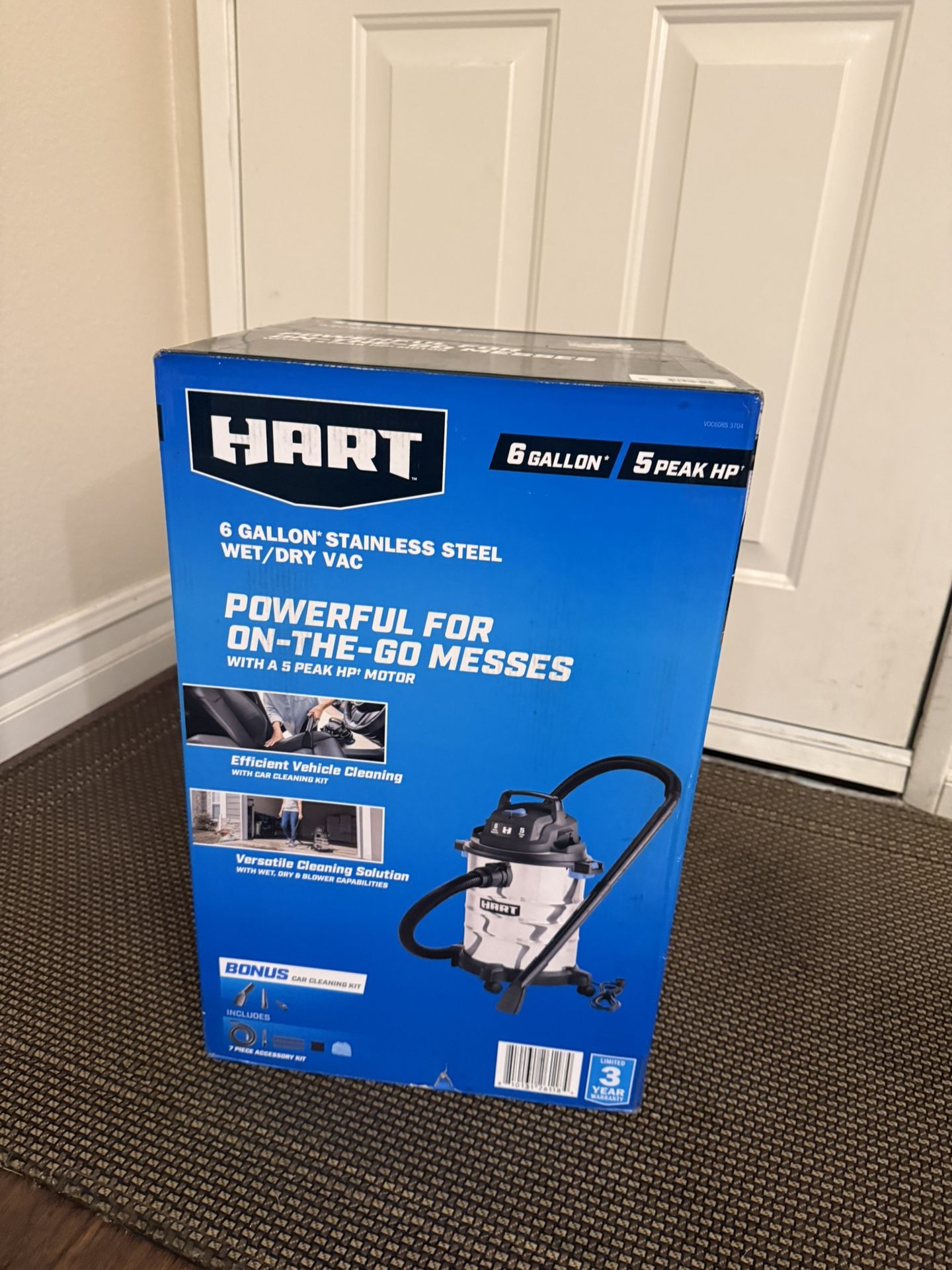 Brand new $45Firm 6-Gallon Stainless Steel Wet/Dry Vacuum, New The 5 Peak HP† high-performance motor provides the power you need to tackle those tough projects. The on-board hose, cord and accessory storage allows you to keep all of your attachments organized, and the casters and balanced top handle make it easy to transport the vac during and after use. This vac comes with 10 accessories including a bonus 3-piece car cleaning kit which features a car nozzle, blower nozzle and detail brush. Easily convert your vac into a blower to remove debris from your yard or workspace by simply connecting the hose to the blower port. This vac is equipped with 14-foot cleaning reach with the hose and power cord, as well as 3 extensions wands to extend your reach. Premium Stainless Steel Tank • Powerful 5 Peak HP† High Performance Motor • Complete Vac Organization with On-Board Hose, Cord and Accessory Storage • 8’ Power Cord with Cord Storage • Easily Converts to a Blower • 14-Foot Cleaning Reach with Hose and Power Cord • Large On/Off Dust Switch • Includes: 1-1/4” Diameter Hose and Attachments, 6’ x 1-1/4” Hose, (3) Extension Wands, Crevice Tool, 3-Pc Car Cleaning Kit, Reusable Cloth Filter, Foam Wet Filter