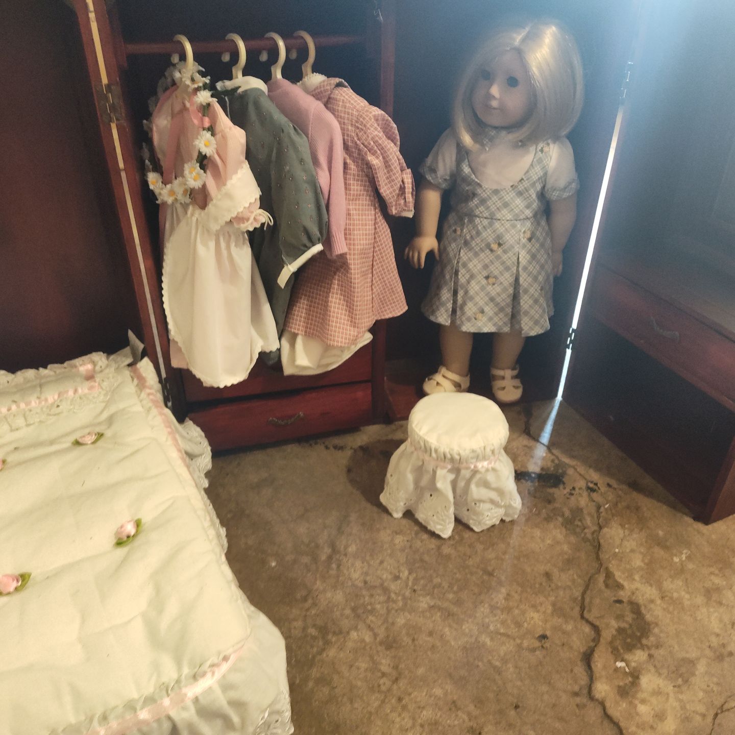 American girl doll with travel case. Bed, 2 sets of bedding, 3 drawers, mirror, 4 extra outfits plus one she is wearing and shoes. Latch is good. Handle is good. Metal corners are all there.