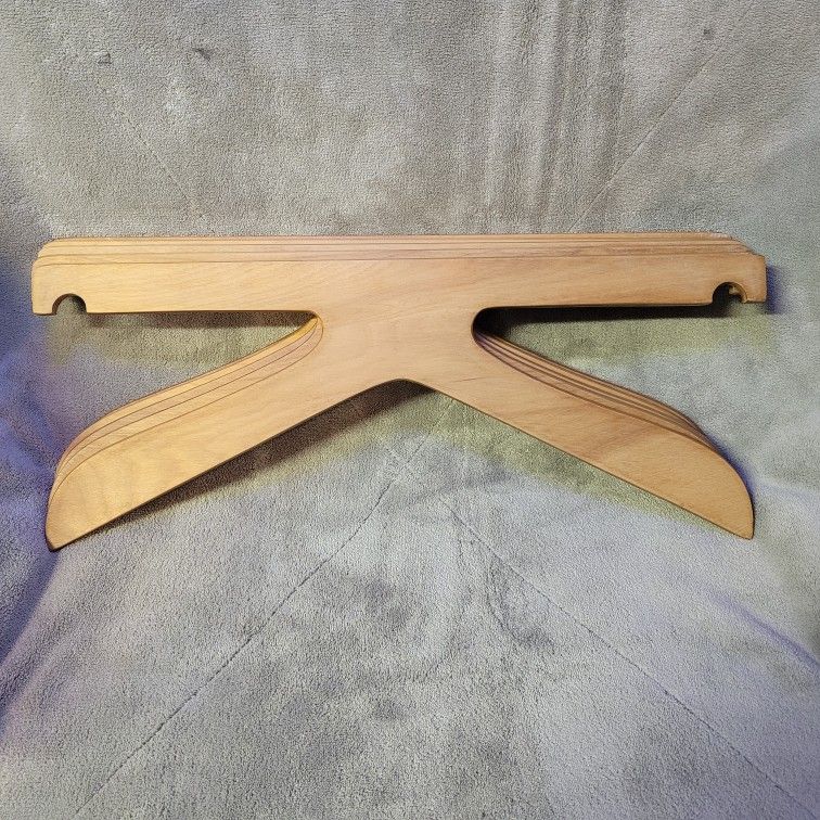 Set of 5 The items in the image are wardrobe trunk hangers, also commonly known as steamer trunk hangers. These hangers were specifically designed to fit into the hanging systems found within antique or vintage wardrobe trunks and steamer trunks. The unique shape allows them to be securely held in place within the trunk's internal rack system during travel. Such hangers are often considered vintage or collectible items, especially for those restoring old trunks.