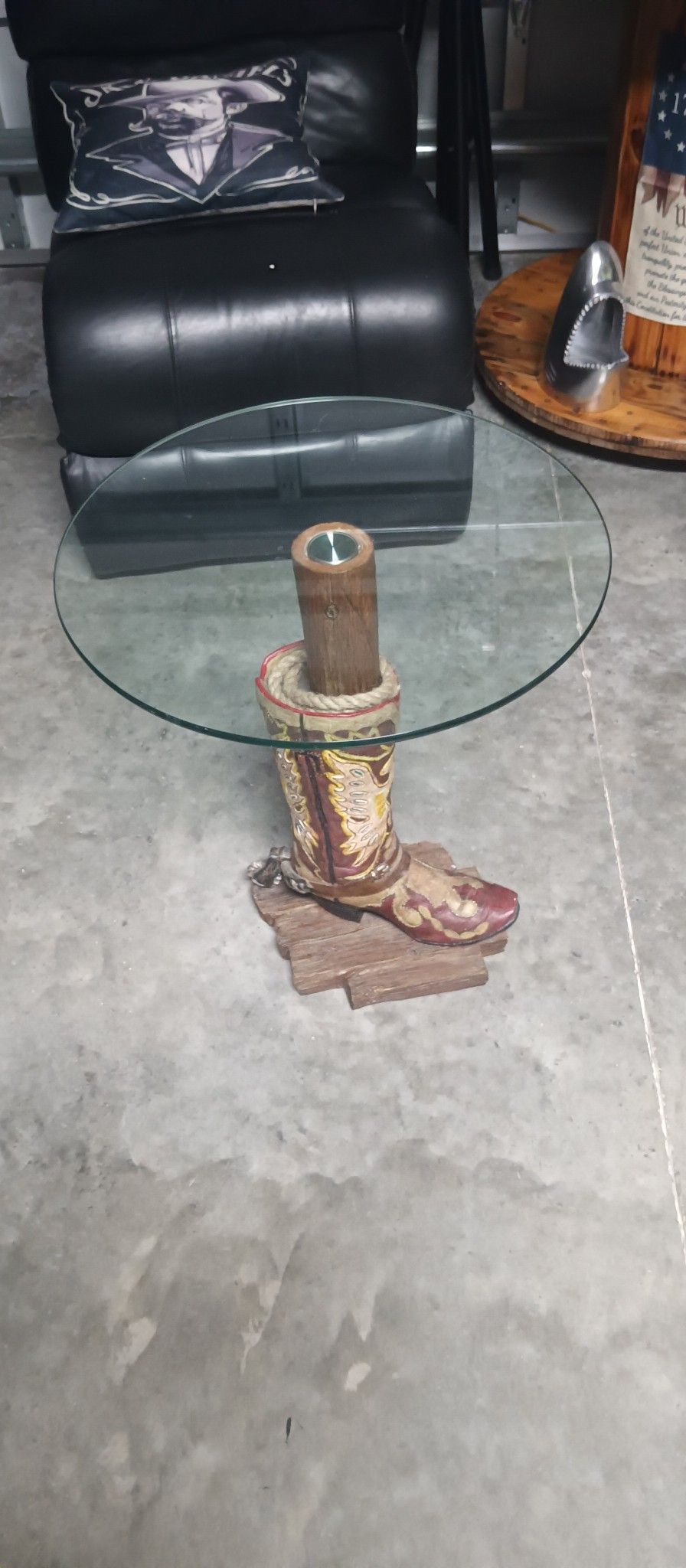 Cowboy boot table mounted on a plank glass top with rope inside boot