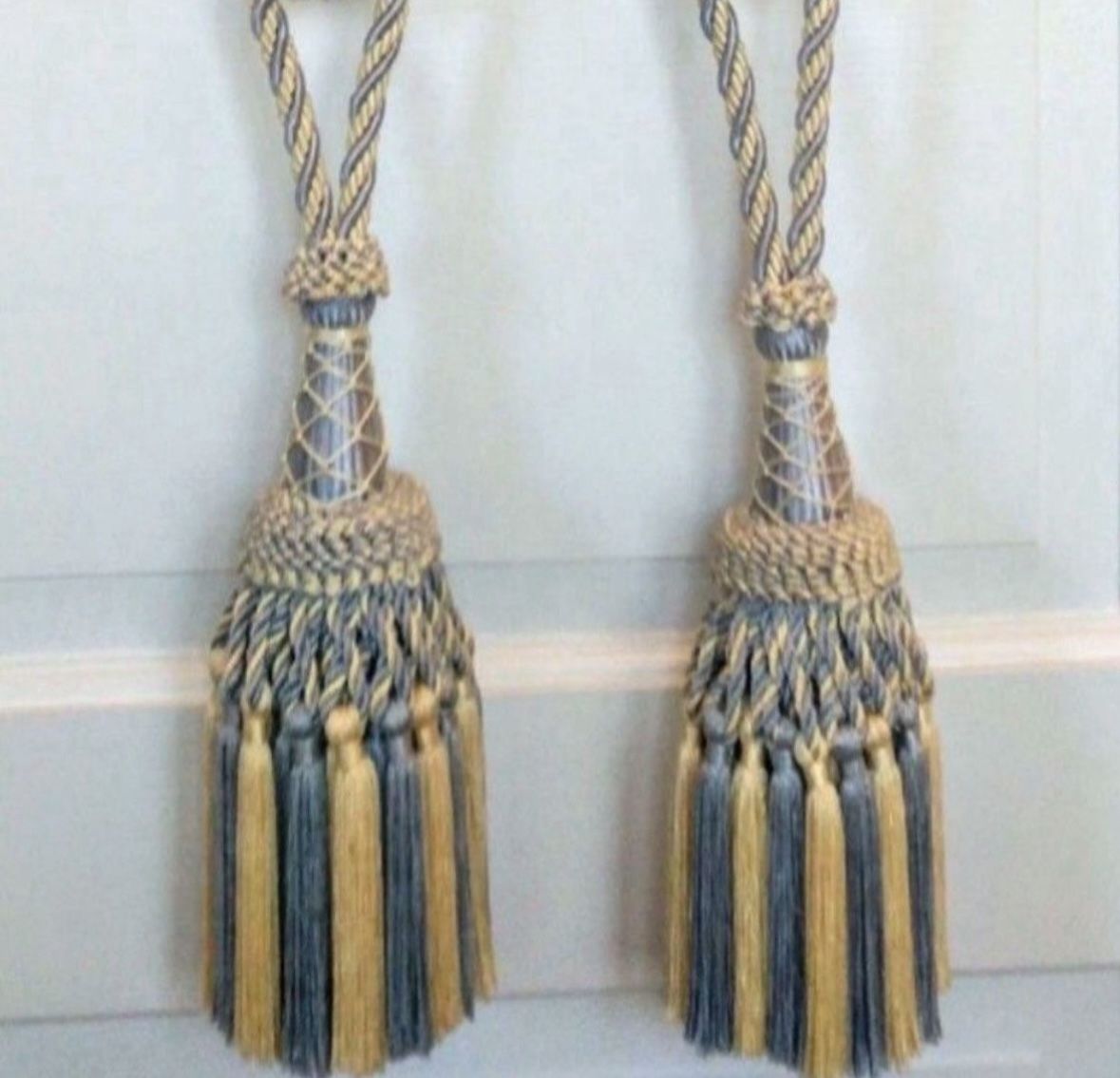 Pair of beautiful light blue and pale yellow tassel curtain tie-backs. Very good condition. Measure 27" when hanging as shown in photo. From pet-free/ smoke-free home.