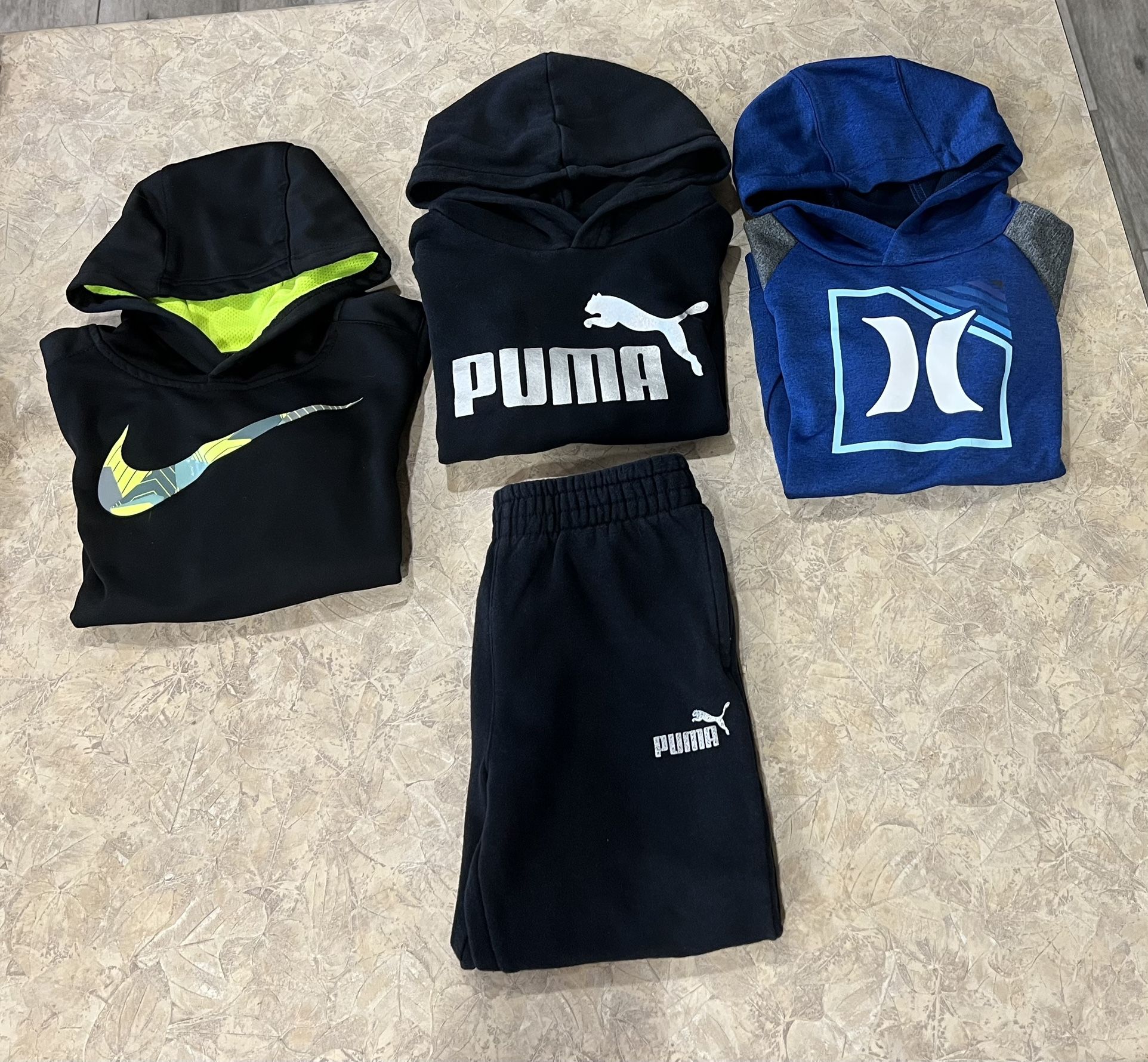 Boys Brand Name Sweatshirts Size 5-6 kids Nike, Puma, Hurley Includes 3 sweatshirts and 1 matching sweatpant (pants have a small tear on one leg as shown) Located in south Chandler