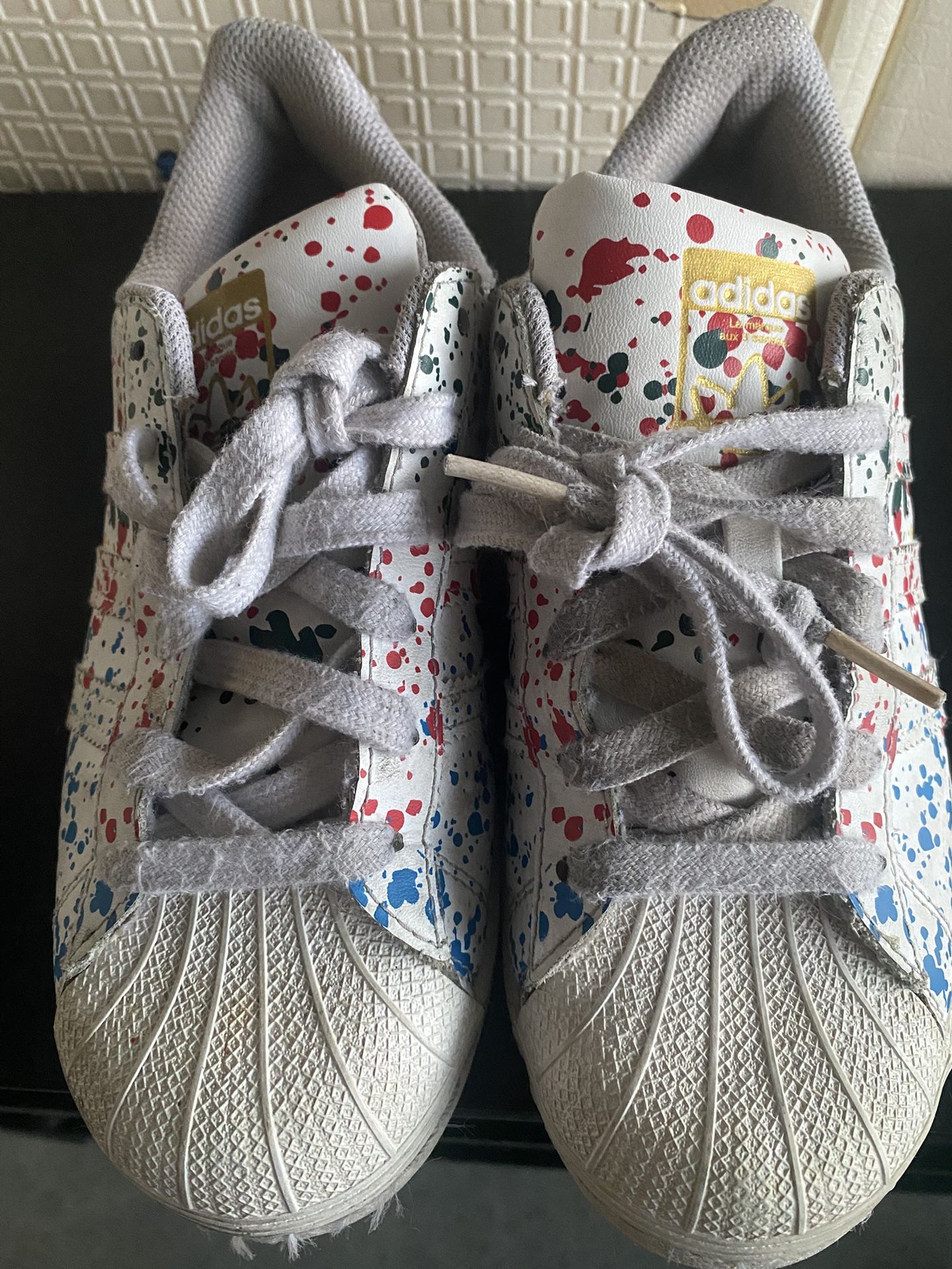 Vibrant splatter design with gray, blue, red, and green accents. Stylish and comfortable for kids. Pre-owned without box. Size 5.5.