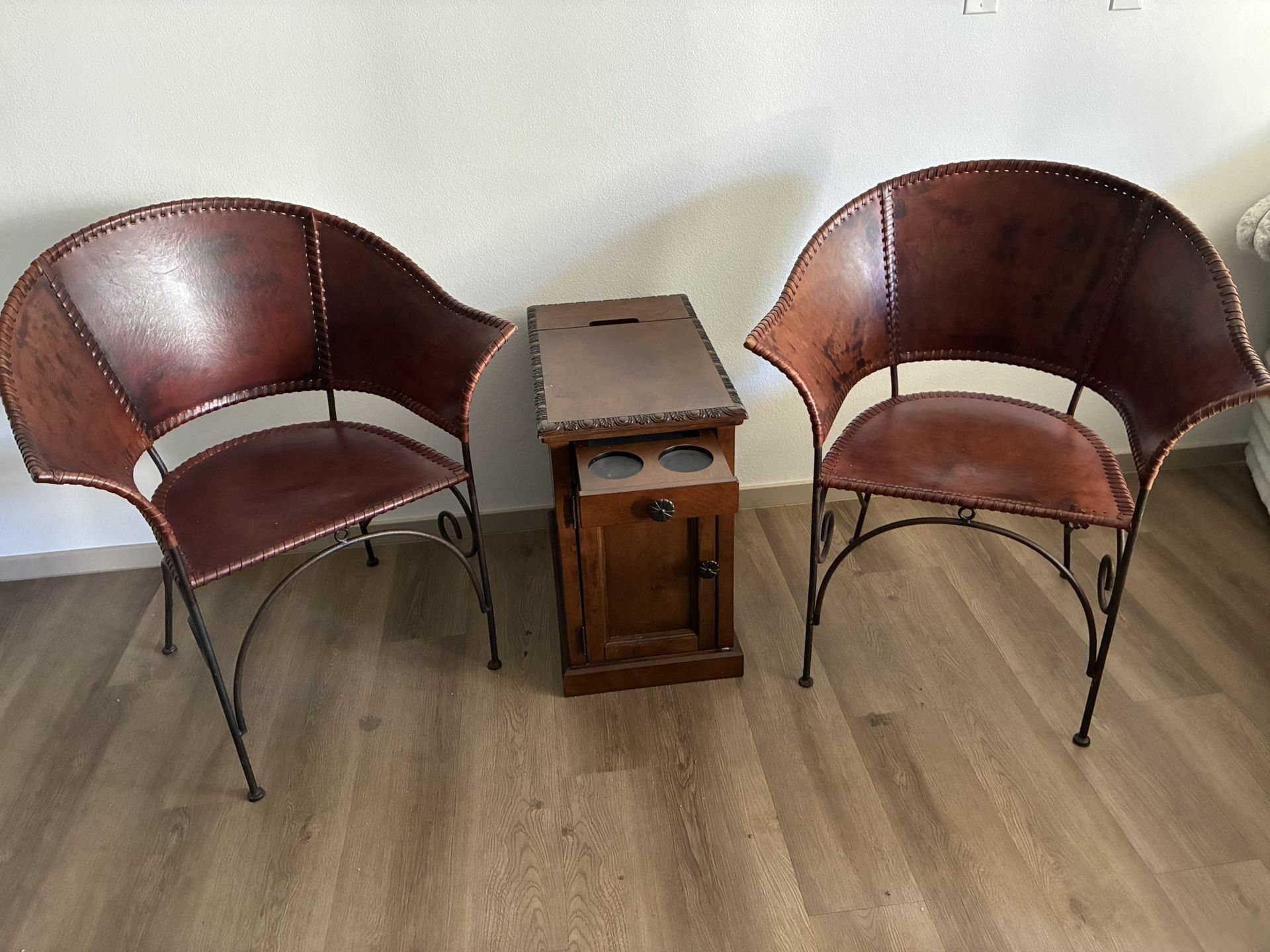 Very comfortable and sturdy chairs (2) - leather wrapped wrought iron frame. Hard wood storage accent table. Slide out cup holders. Also has power and charging ports in back.