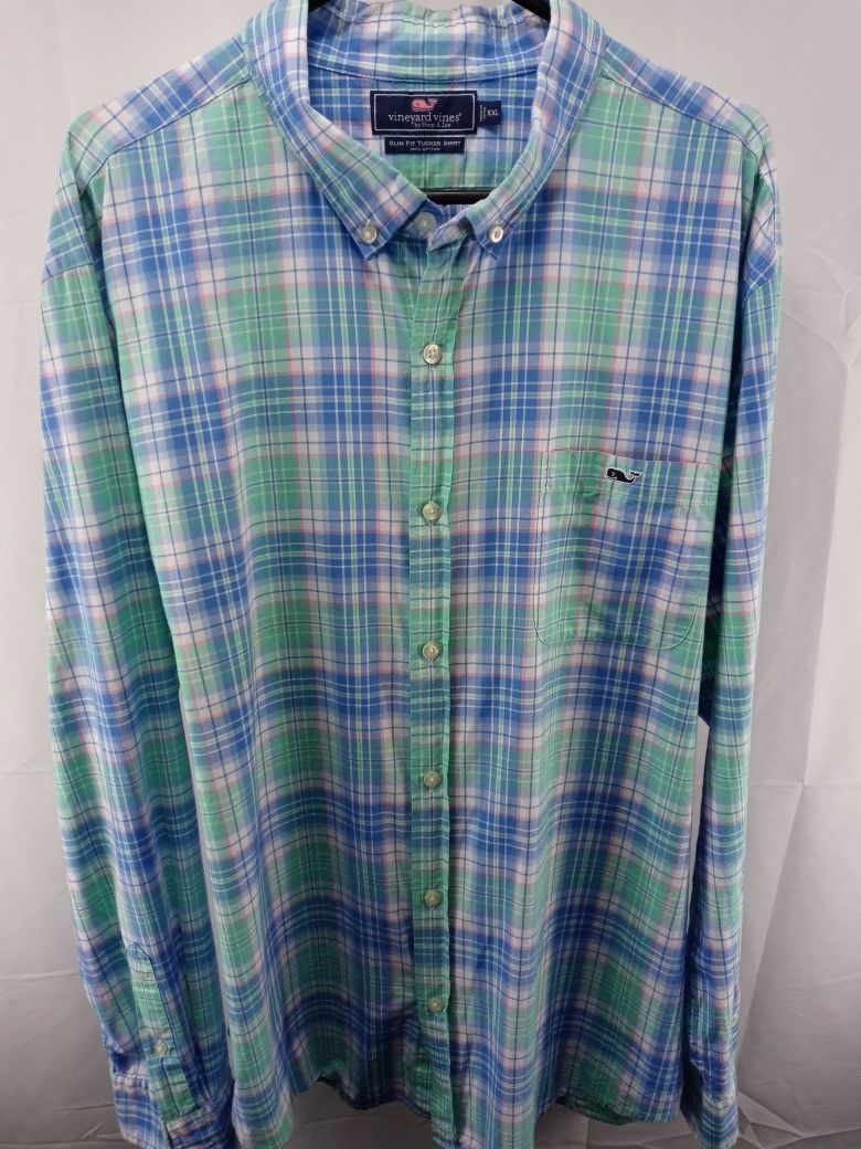 Vineyard Vines Mens Size 2XL Multi Colored Oceanic Plaid Whale Shirt. Great condition awesome color combination and design beautifully crafted shirt gorgeous attention to detail and craftsmanship. Signature embroidered whale logo. Pit to Pit/Chest 28" inches (52" inches Total) Shirt Length 32" inches. Msrp $119