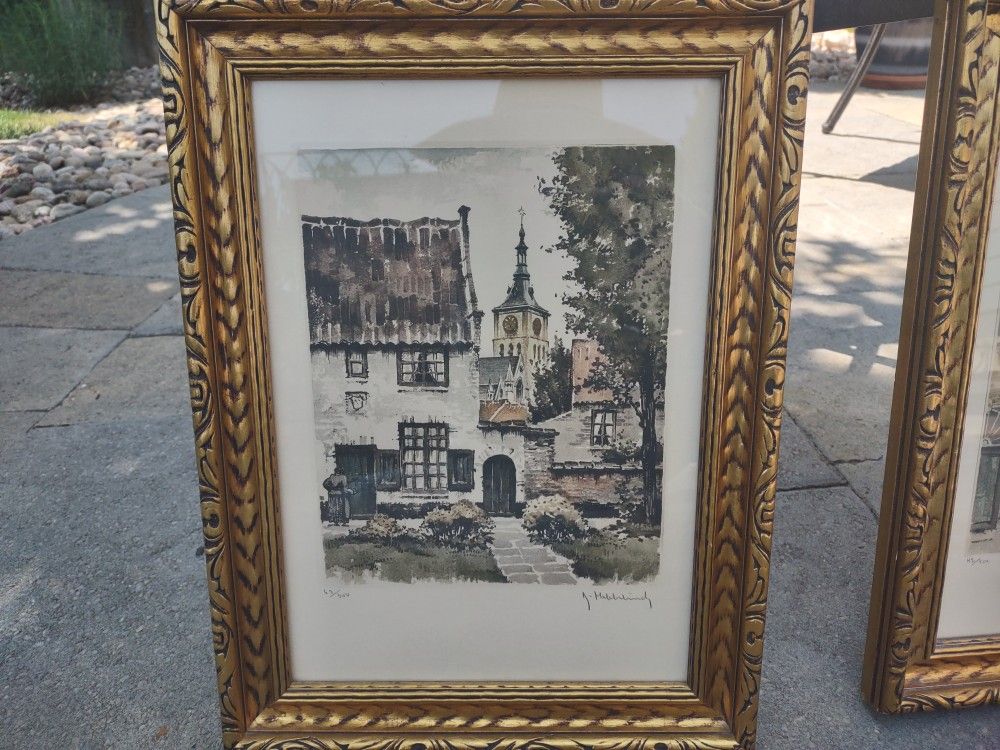 12 x 16 inch framed watercolor prints. Wire across back for hanging. Paper backing has a few tears. The clock tower is numbered #63/350 The arch is #23/350 artist Hubbeling Will sell both for $40.00 or $20.00 for one .