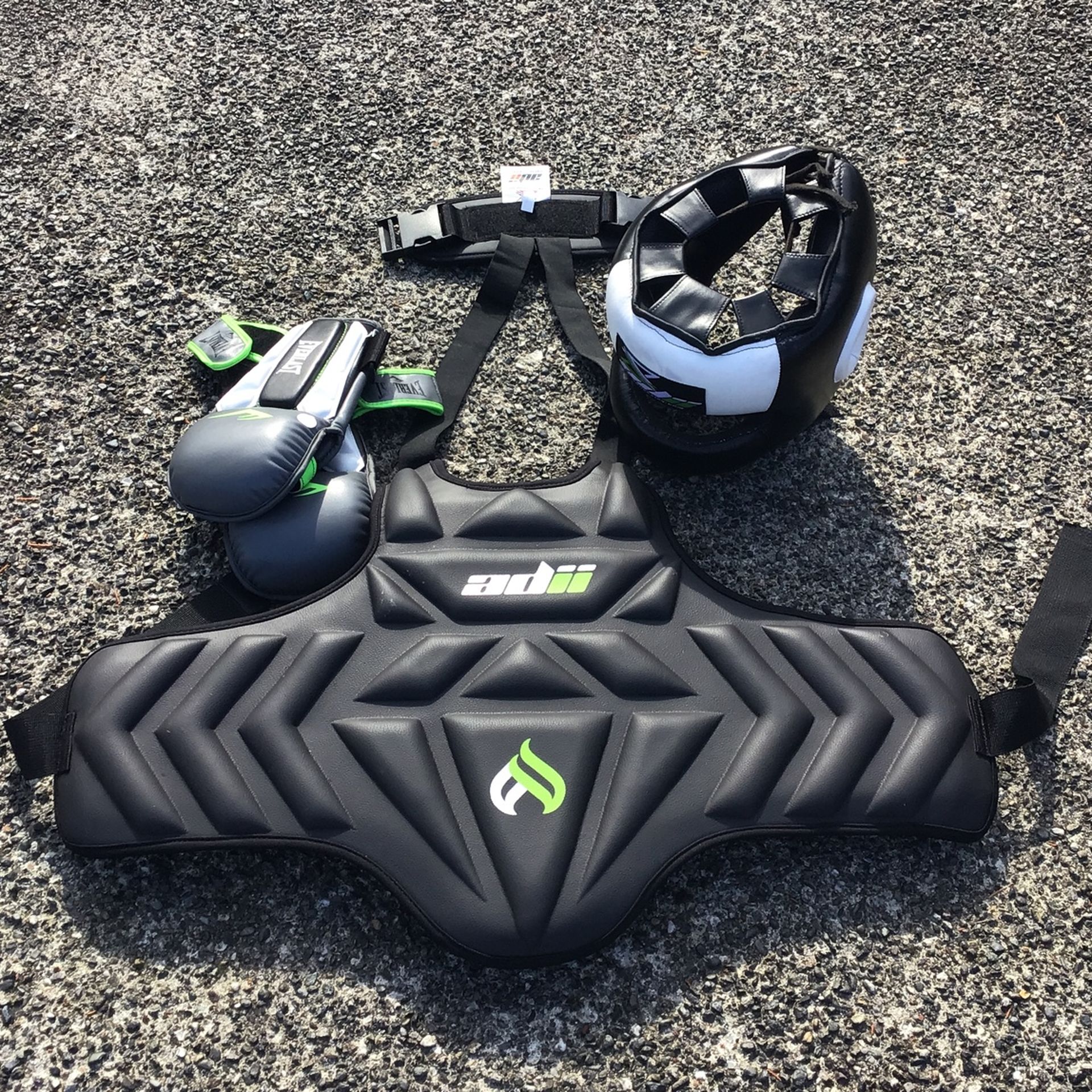 All together one price the chest guard is new and the helmet is lightly used the gloves are like new. Brand is adii for the cheats guard and helmet and evertlast for the gloves