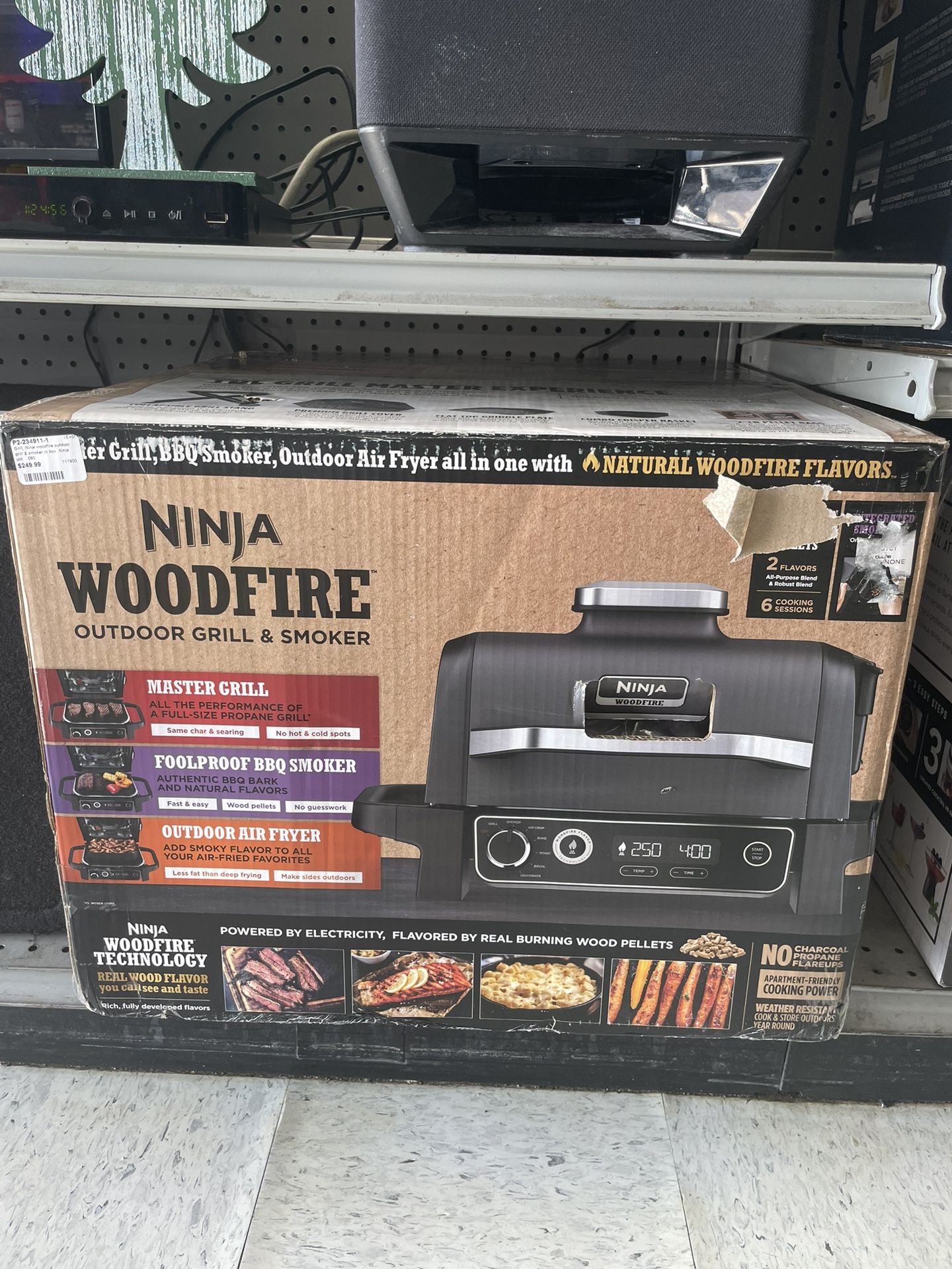 Ninja Wood fire Grill It is an electric-powered, weather-resistant outdoor appliance that functions as a master grill, BBQ smoker, and air fryer all in one. The grill uses Woodfire Technology, which flavors food with real burning wood pellets, not charcoal or propane. It offers six cooking functions and two different flavor blends of pellets. Key features include non-stick surfaces for easy cleaning and precise temperature control. Retail $349.99