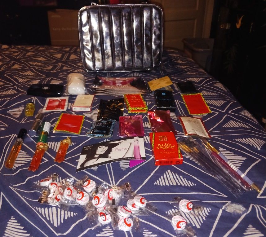 Women's Makeup, Perfumes, & More LOT All Brand New. 20- facial compressed masks, 5 makeup accessories, 2- Givenchy Organza Eau De Perfumes, 1- Lancome Paris Tresor perfume, Revlon 706 Frost Moondrops lipstick 24k orange, 1 lipstick case makeup brush, Chanel perfume sample, Givenchy samples, & small bottles perfumes, Bath gel samples, I WANT CHOO FOREVER JIMMY CHOO 2ml perfume, Donna Karangold perfume Sample, 1- new cloth rag Clinique, 4 perfect lifting premium masks by Avajar & 1 Lancome zip up makeup case. All for $45