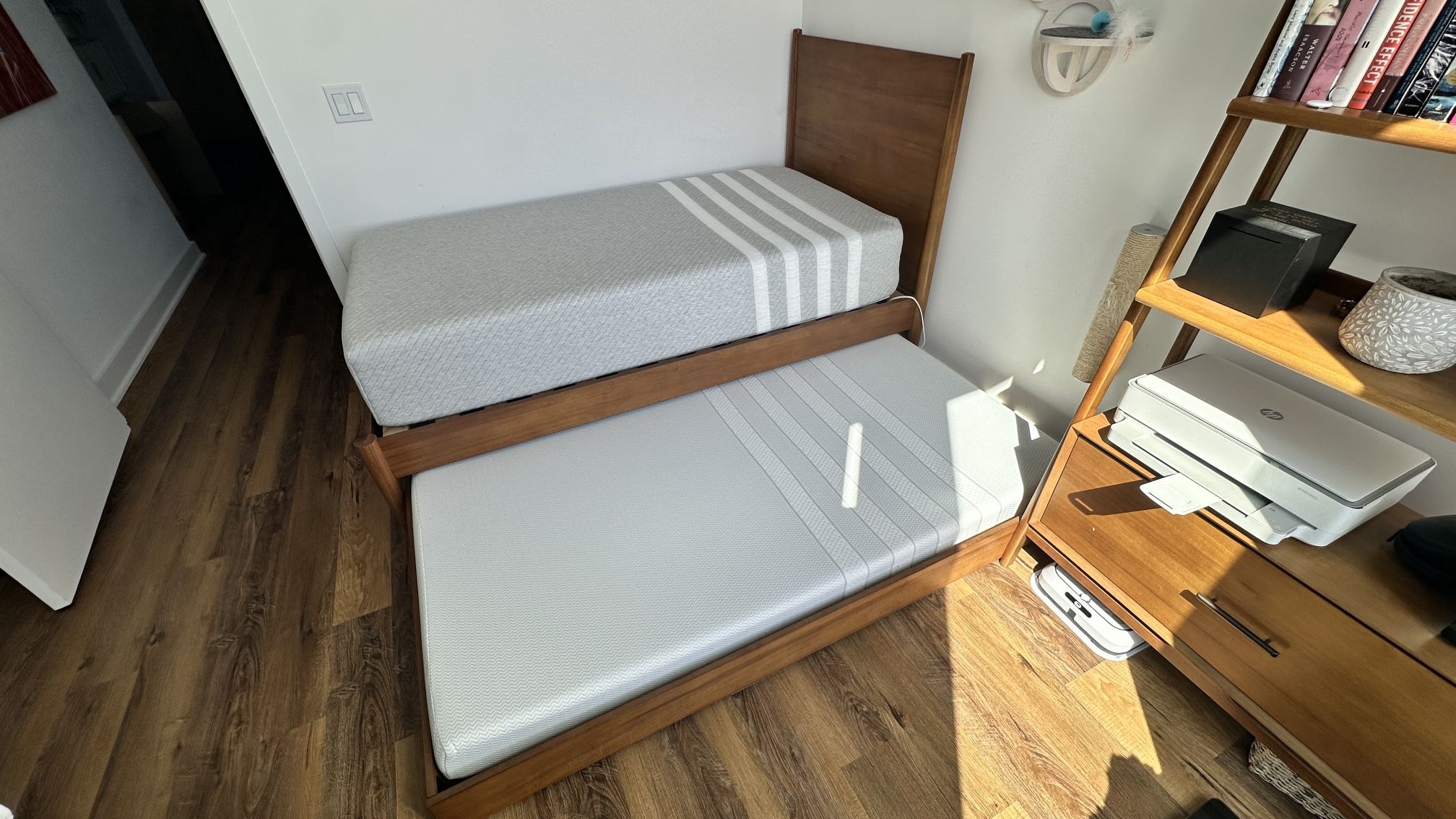 • Twin trundle from West elm. Selling with or without the mattresses (they were purchased brand new and have barely been used a hand full of times). • Trundle is on wheels and can open to the left or the right • Available now • Furniture is in new condition • overall dimensions: bed is 42”w x 78.75”d x 46.75”h trundle is 74.5”w x 40.5”d x 5.8”h • Link to see on website: https://offerup.com/redirect/?o=aHR0cHM6Ly93d3cud2VzdGVsbS5jb20vcHJvZHVjdHMvbWlkLWNlbnR1cnktdHJ1bmRsZS1hY29ybi1oNzE2MS8/cGtleT1zV0U=