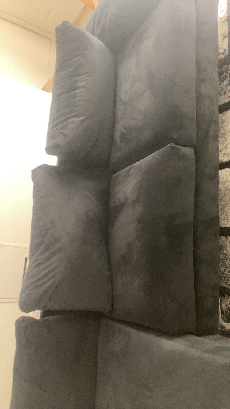 Black sectional couch. No holes, tears, rips or slits. 8 1/2 out of 10 condition. No Smell. Easy to put together and take apart.