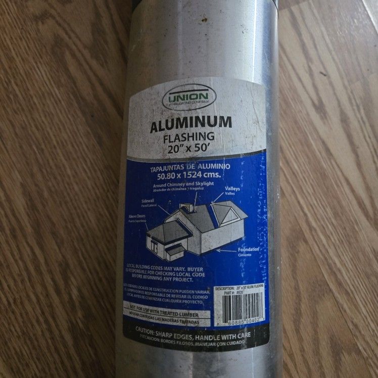 New UNION Aluminum Flashing available. This is a 20-inch x 50 foot roll, also 50.80 x 1524 cms. Good for around chimneys, skylights, valleys, sidewalls, above doors, and foundations. Just a heads up, not for use with treated lumber and sharp edges, so handle with care.