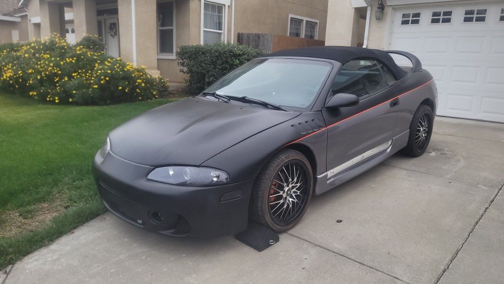 Definitely regret having to post this but it's time. 1996 Eclipse GST Spyder. Im the 3rd owner. Alot of work done. It originally was all white, It was initially a show car in the east coast. 2nd owner wanted to go more OEM style for track and repainted . I've reworked body, engine & interior. Needs adjustment and a tune. No check engine. ODO 144000. Starts and runs. Just running rich. Not smog ready for Ca. Real clean. Convertible top is new prior to owning it. Garage kept for the past 7 years since owning. Paint is great all around. 2 tone Matte black top/silver bottom with orange stripe Full front end carbon fiber hood and fenders. ECM Link V3 Eprom for ECM Tuning RP Head Studs Mishimoto Intercooler 16g Turbo larger intake and Dejon mount K&N Filter HKS Blow Off Valve AEM fuel rail and pressure regulator 1200cc fuel injectors, plugs wires etc Adjustable coil overs - forgot the brand Stage 2 clutch 4 inch pipe and exhaust Grillcraft Grill inserts Koenig wheels Hancook tires Powedercoated engine covers and parts 3 gauge pillar. AEM Air/fuel ratio, Tru Boost, Fuel pressure. TACH 90% black interior, New carpet. Driver/passenger custom stitched carbon fiber OEM Seats Momo steering wheel and shift knob Wired Sound System. Alpine deck, Rockford P1 speakers front rear, 10inch Rockford in custom box. 1000w Rockford amp. 2 Caps Viper5701 Alarm with remote start I'm sure I'm missing stuff. No joy rides. Trying to find a owner who has experience with 2nd Gen Eclipse.