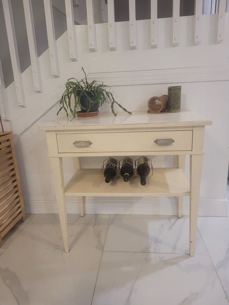 Cream colored console table with beautiful hardware, paint is wearing along the front edge. Could make for a lucrative furniture flip if refurbished, dressers and other pieces from this collection are selling for over $1000, I just don't have time to fix it up myself 32Wx19Dx30H