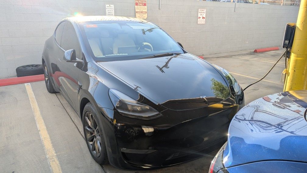 Black Tesla model Y Performance with White interior. Amazing acceleration and 21" rims In excellent condition has about 220 miles of range on a full charge. Comes with floor mats. The steering wheel started to peak so it has a cover on it.