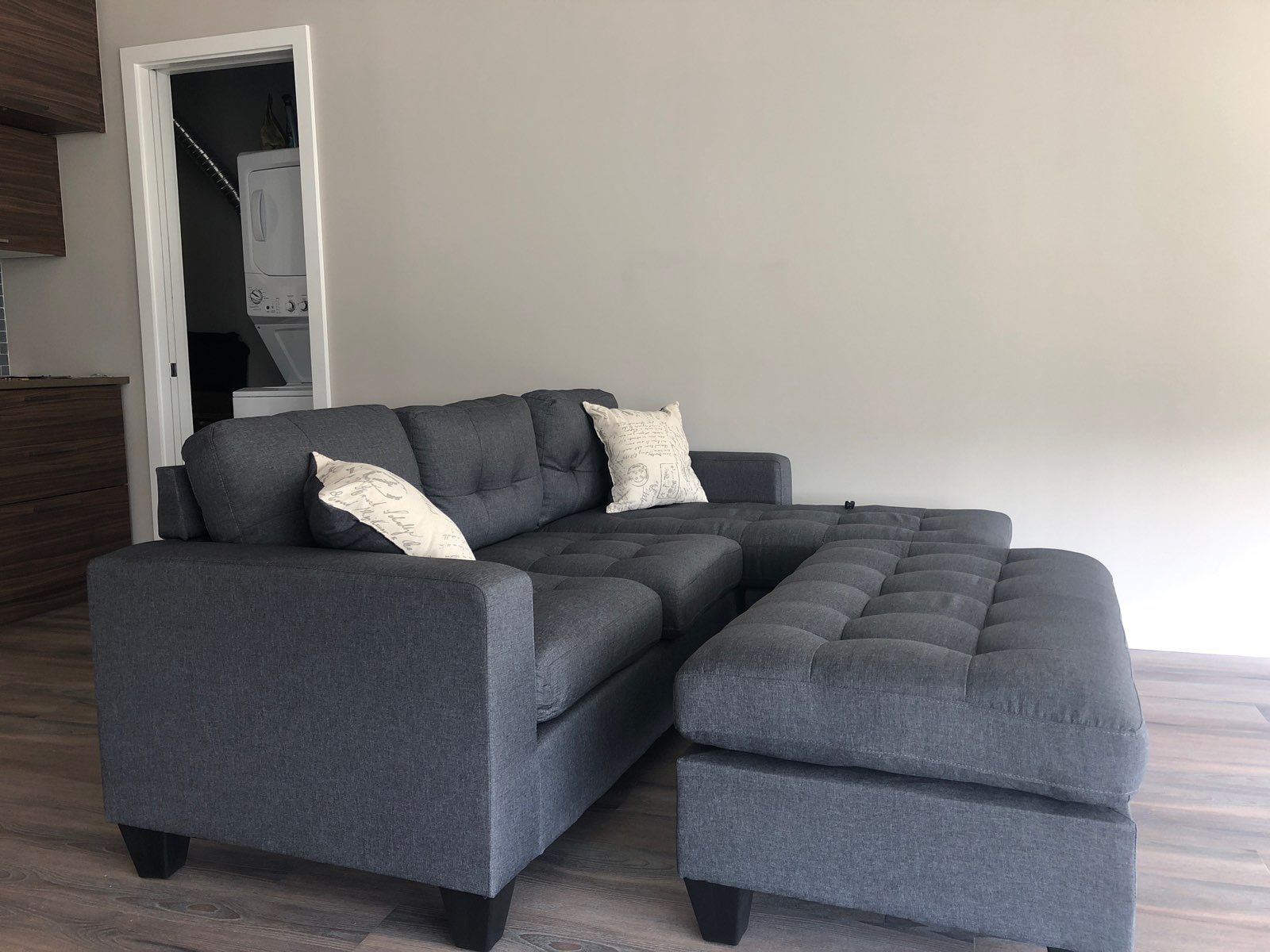 Brand new in the box Available in 5 colors Gray Light gray Brown Black Blue Sectional measurements 81”x59”x34”H. Delivery available for additional fee depending on your location