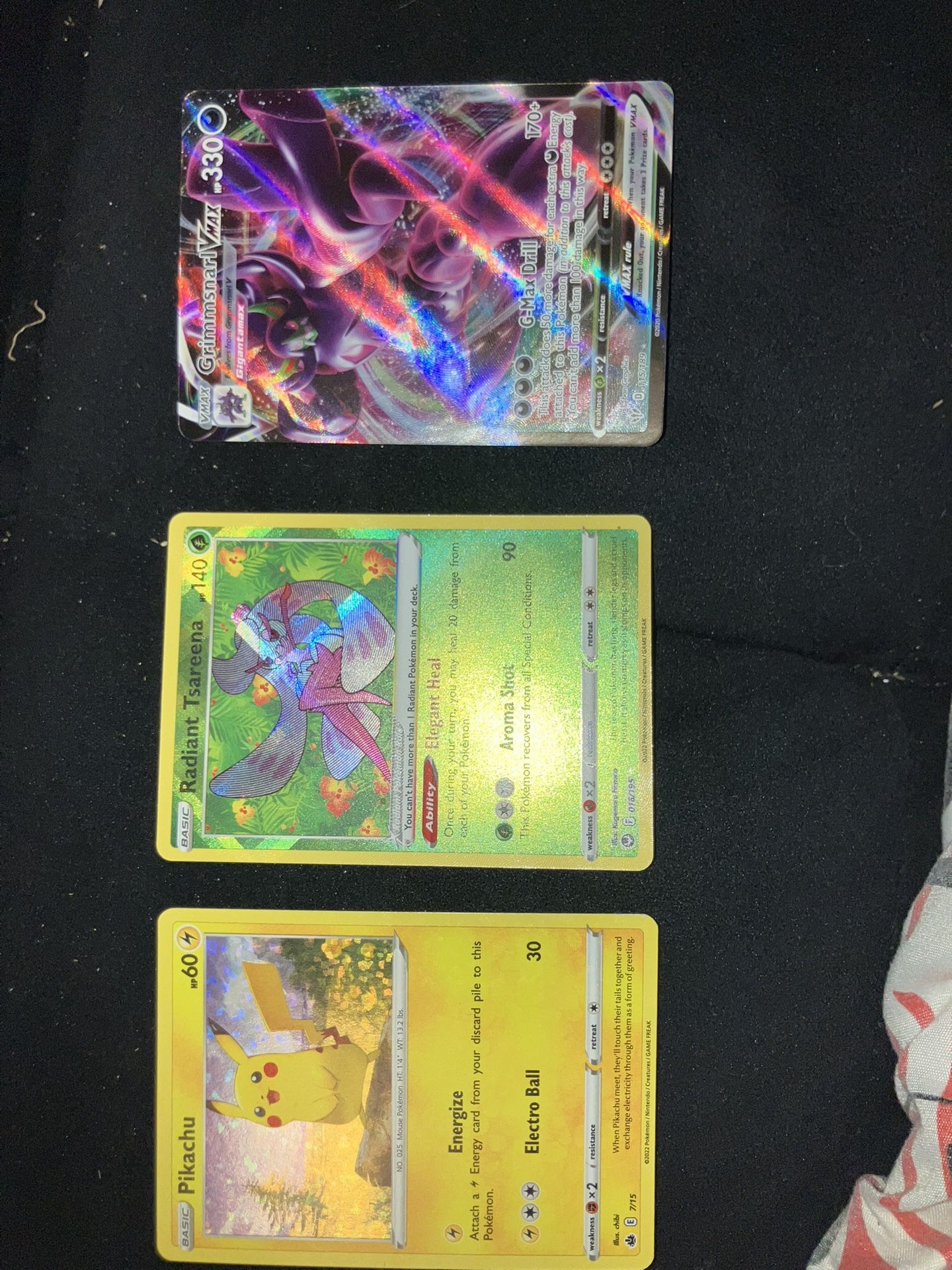 Pikachu 7/15=$600 Radiant Tsareena 016/195=500 Grimmsnarl vmax 115/189=150 All 3 for$1000