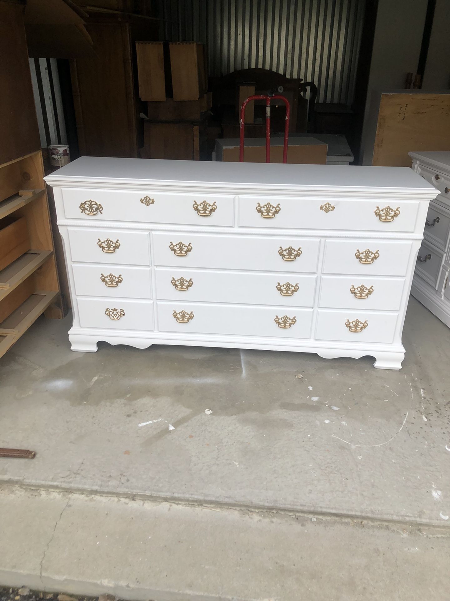 White 11 drawer solid wood dresser. L. 64. X h. 35. X d 17. Newly painted