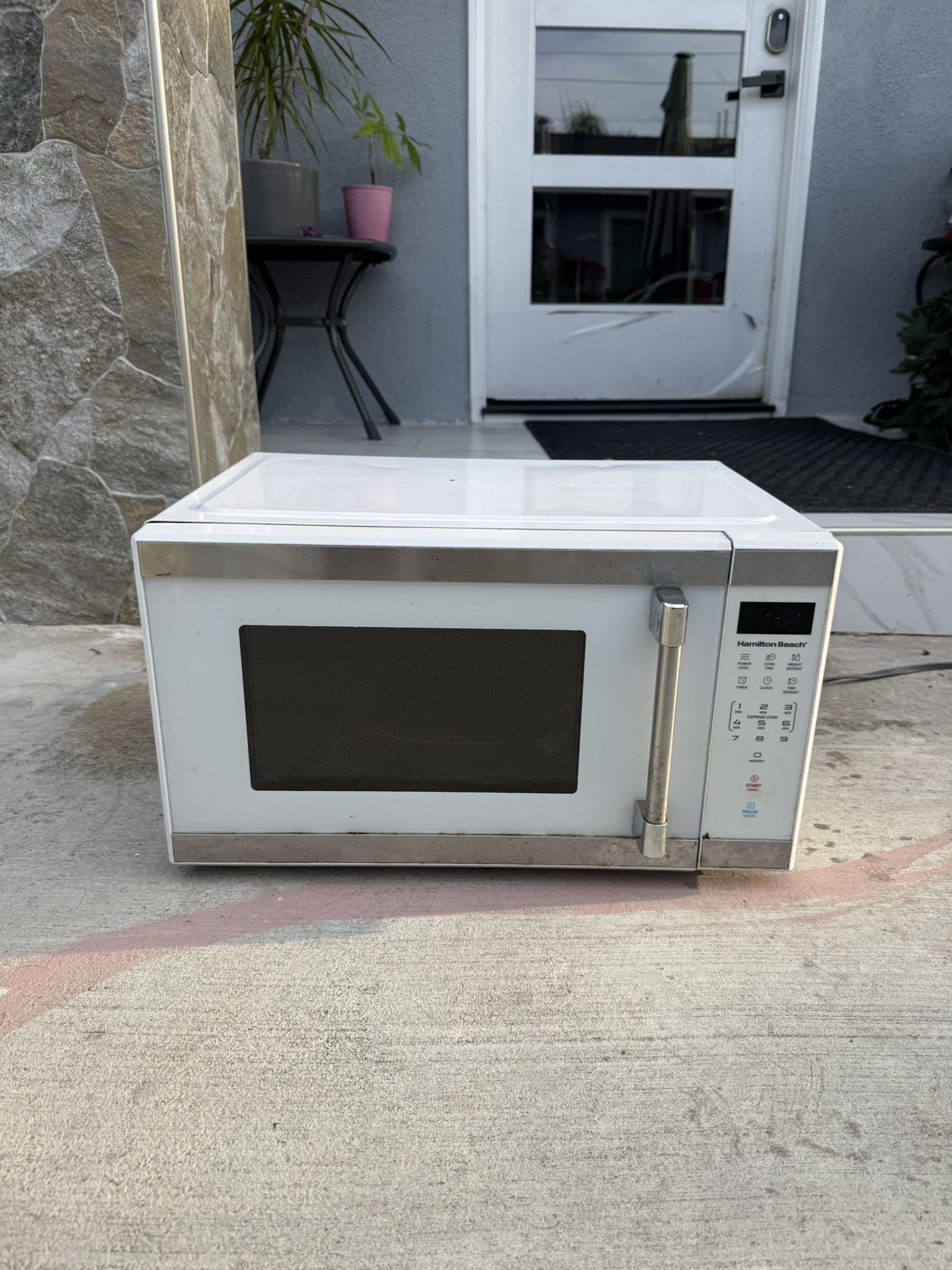 Hamilton Beach 1000-watt microwave in working condition. Heats food properly and includes the glass turntable plate. H 12in x W 20in x Depth 14in Good for a garage, office, dorm, or rental unit. Details: • 1000 watts power • Multiple cooking presets • Digital keypad • Includes glass turntable • Standard countertop size Cosmetic wear and some rust on the bottom/back (see photos), but it still functions. Pickup in La Mirada.