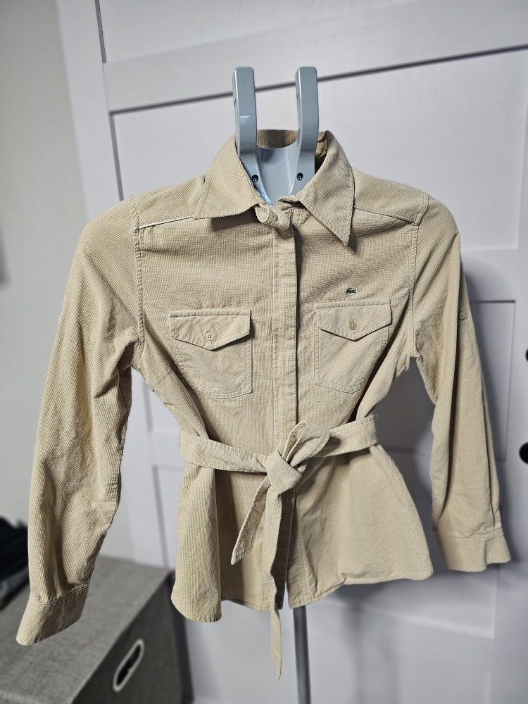 This is a Vintage Authentic Lacoste women's brown tie-waist long-sleeve shirt with pockets. Only used once and in great condition. No wear or tear. They're perfect for business casual fall/winter outfits to pair with jeans or dress pants. Sleeves can be worn in 3/4 sleeve (See pics) Size: SEE PICS ***Committed & interested buyers ONLY!