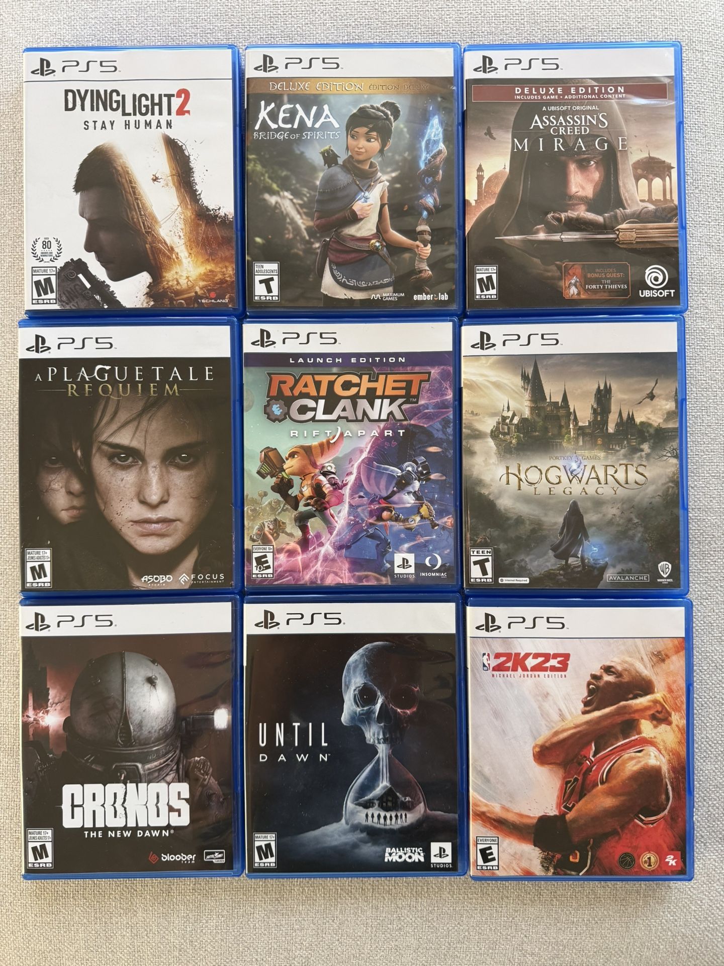 Dying Light 2 $15 Kena $20 Assassins Creed Mirage $40 A Plague Tale $30 Ratchet Clank $40 Hogwarts $25 Cronos $50 Until Dawn $45 2K23 $55 All games is like brand new , play only 1 time