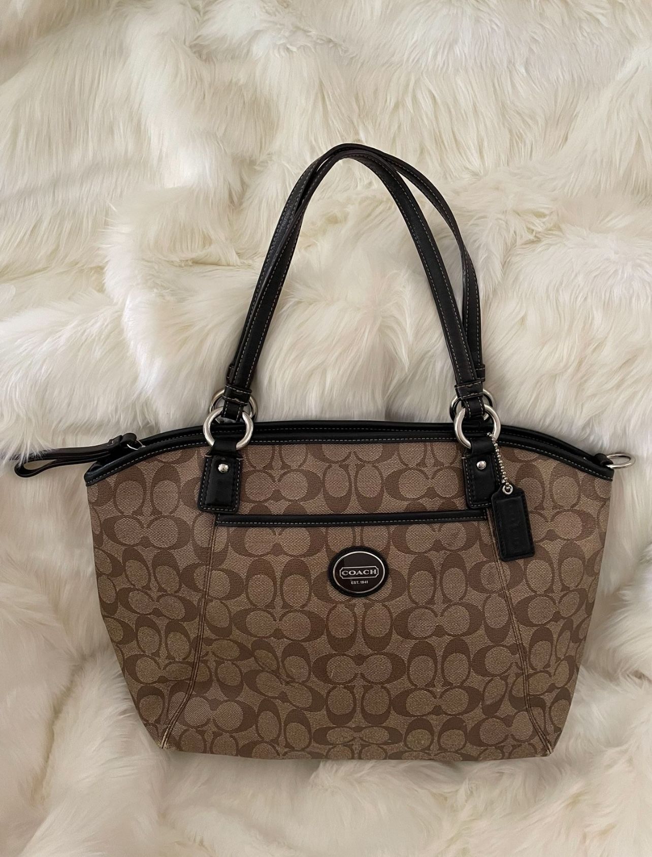Genuine Coach Peyton Signature Coated Canvas leather Tote bag purse. Pre-owned , good condition. Has very minor scuffs on bottom back corner (see last pic) smoke-free, pet-free home. Measures 14”x10” Great gift idea! $65. FIRM