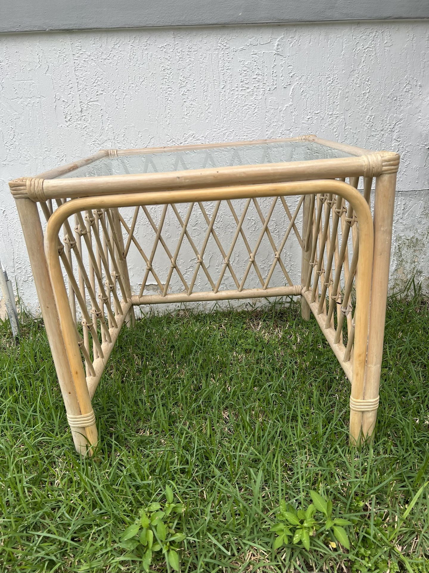 Vintage MCM rattan bamboo w/ glass top nesting table perfect for an outdoor patio serving drinks or food, side table, or a plant stand. H-21 2/2 W-22" L- 22"