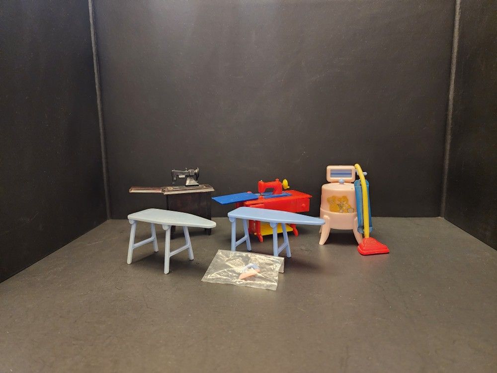 1 Renwal sewing machine, 1 Ideal sewing machine, 1 Renwal washing machine with lid and agitator, Renwal upright vacuum cleaner, 2 Renwal ironing boards with 1 iron, 1 board is faded.