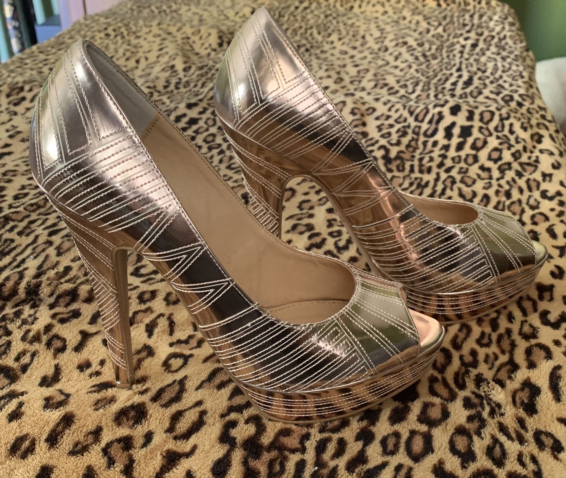 Colin Stuart Stiletto pink metallic pink threading and white carved detail geometric patterns brand new never worn size 7 1/2 5 inch heel 1 inch platform peep toe retail price: 120
