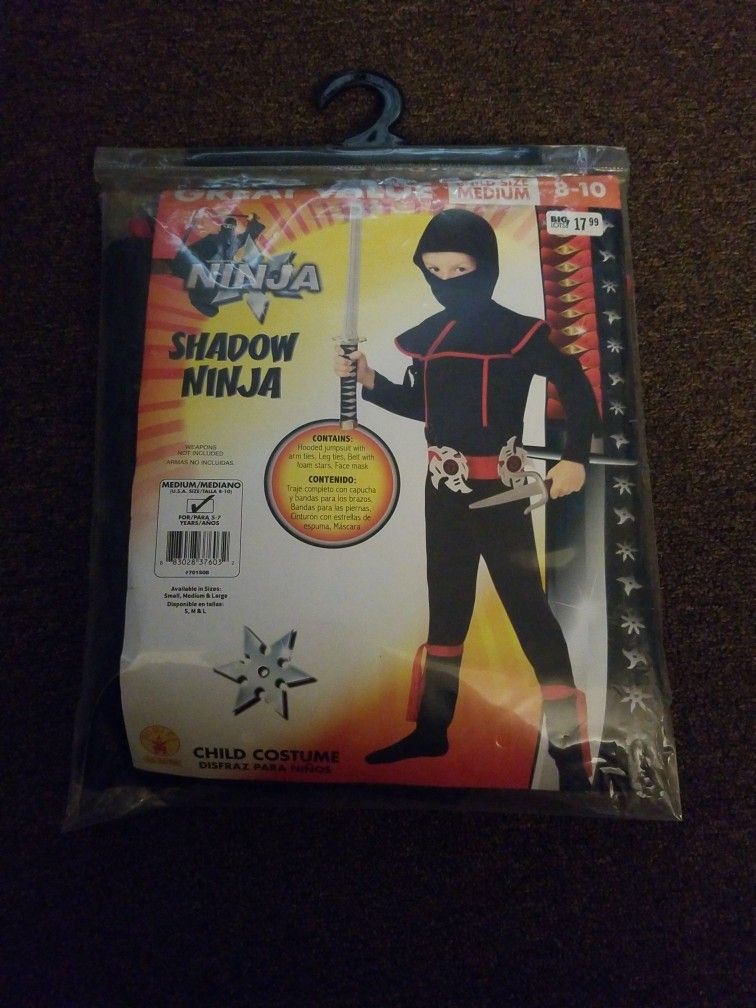 Brand new kids size medium 8-10....(DO NOT INCLUDED WEAPONS) but dollar tree might have them available.