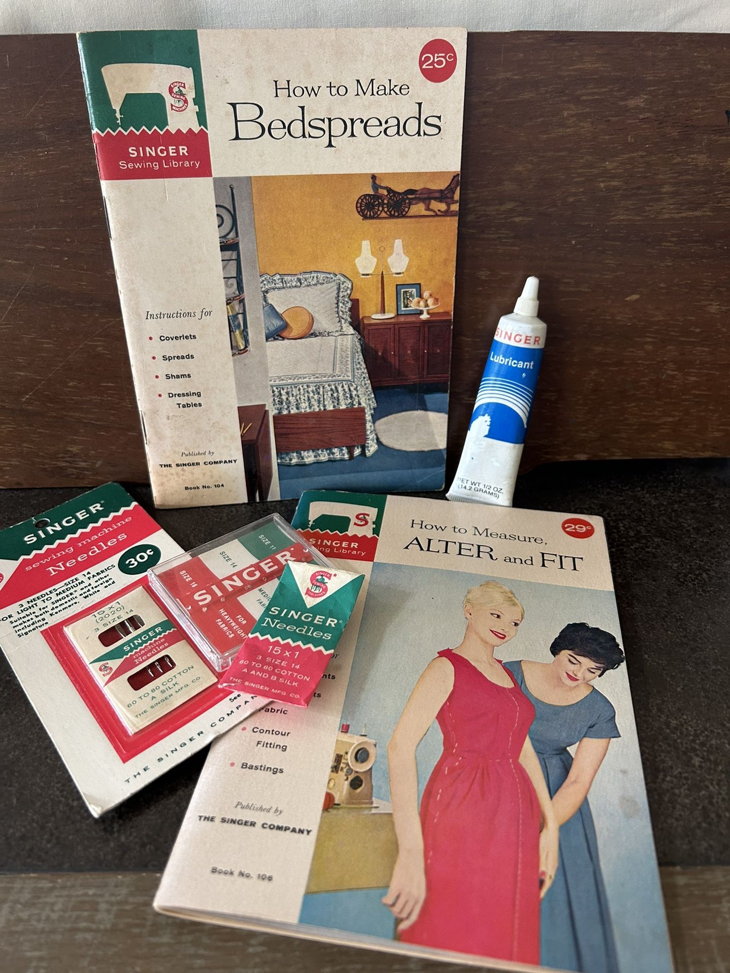 Vintage singer sewing instruction booklets, needle packaging, and machine lubricant.